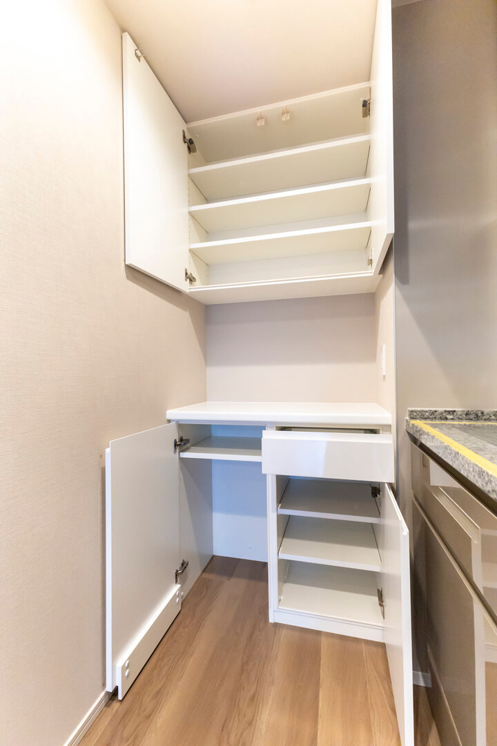調理に集中できる独立キッチン。生活感が出やすいキッチンまわりをさりげなく目隠しでき、調理中のにおいが生活スペースに広がりにくいです。キッチン本体の収納に加え、奥にはカップボードがあり、収納性の高さも魅力です。