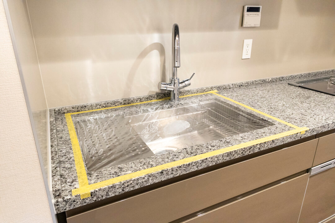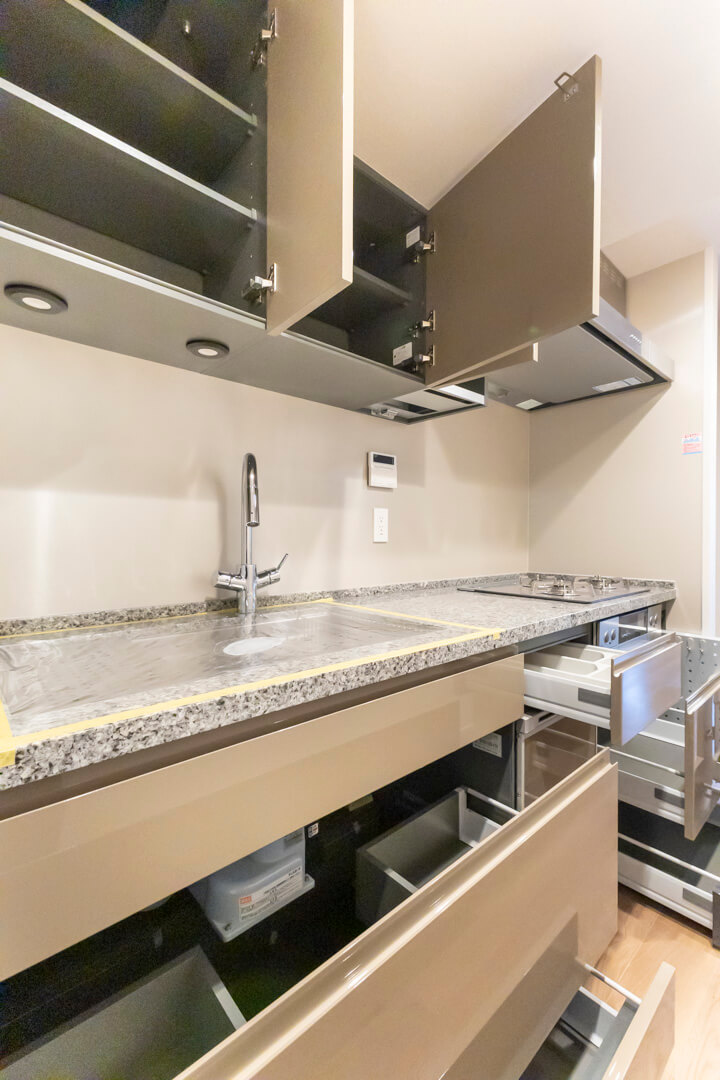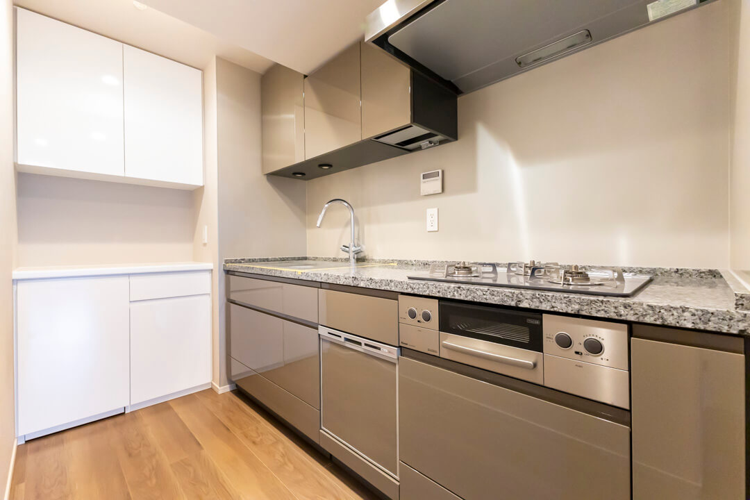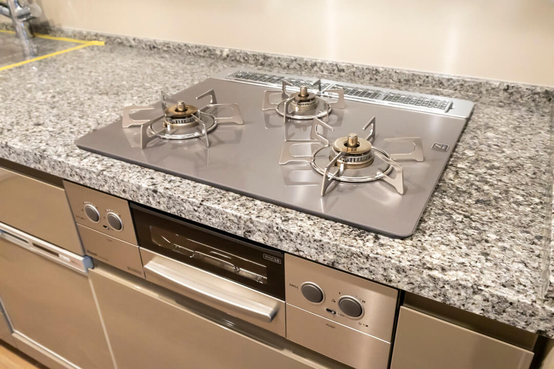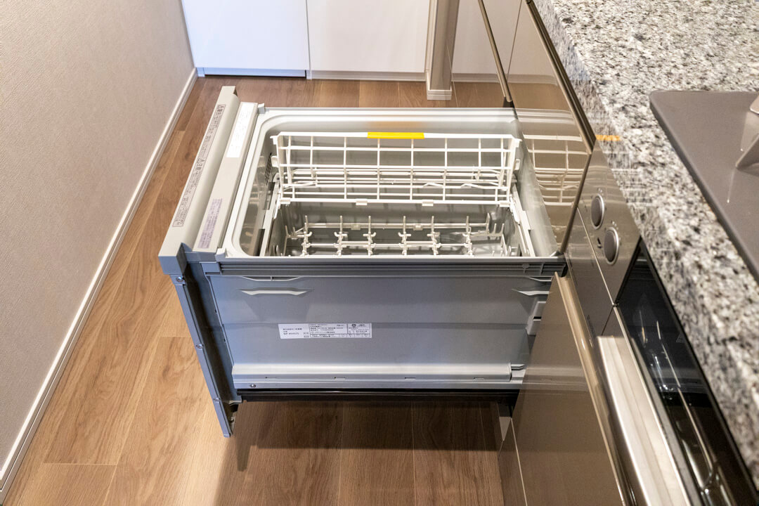 同時調理が叶うグリル付3口ガスコンロを内蔵。さらに、ディスポーザーと食洗機も完備されています。料理後すぐに生ゴミを処理できるので、悪臭の原因を防ぎ、掃除の手間を軽減。食器洗いも捗り、後片付けの時短が叶います。
