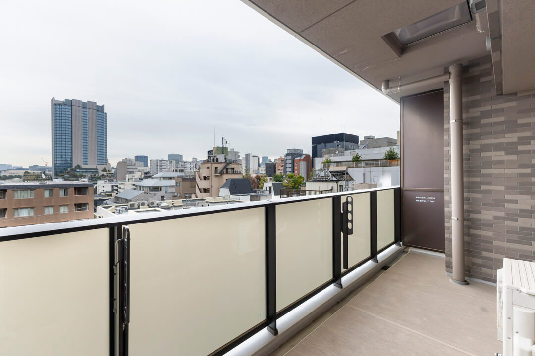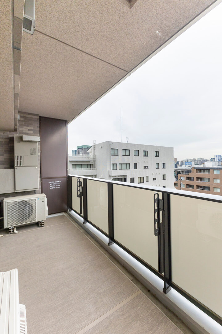 2部屋に跨るバルコニー。9.90㎡の広々としたスぺースです。撮影日はあいにくのお天気でしたが、南東向きのため晴れの日にはあたたかい太陽光が届きそう。遠く広がる空に木々の緑も見える、抜けのある見晴らしです。