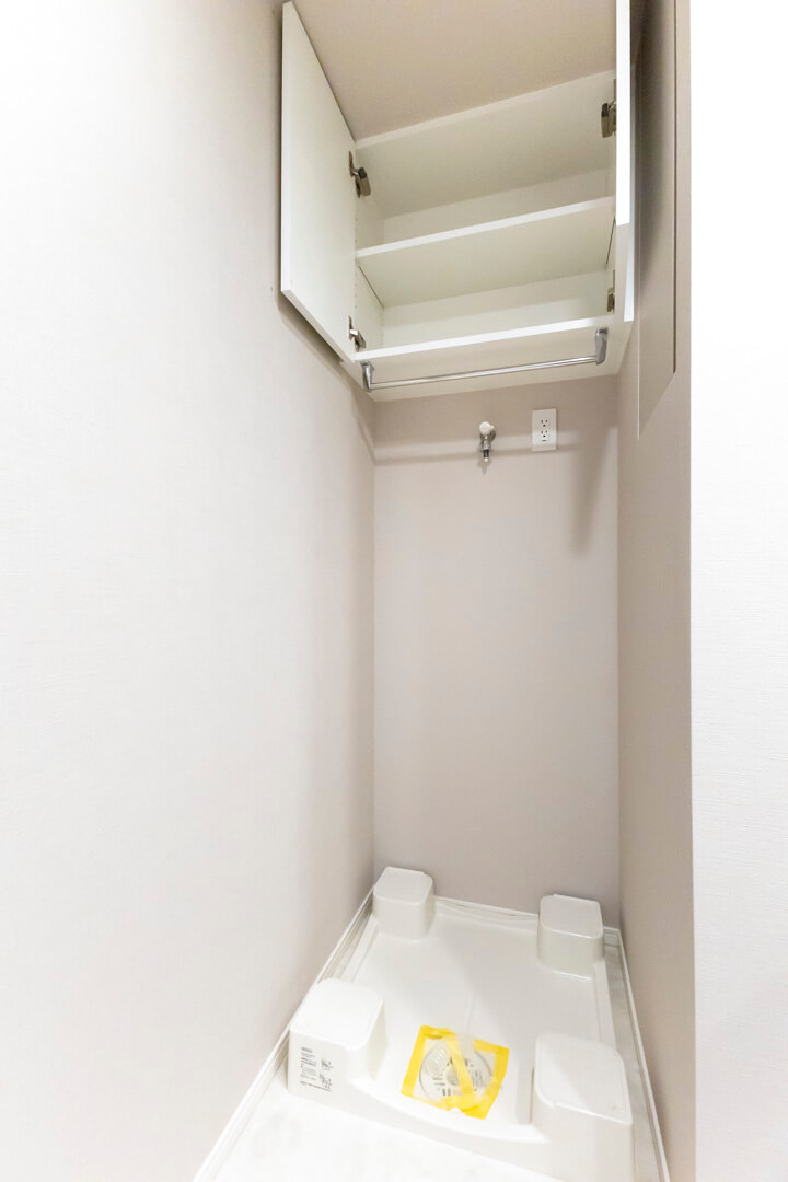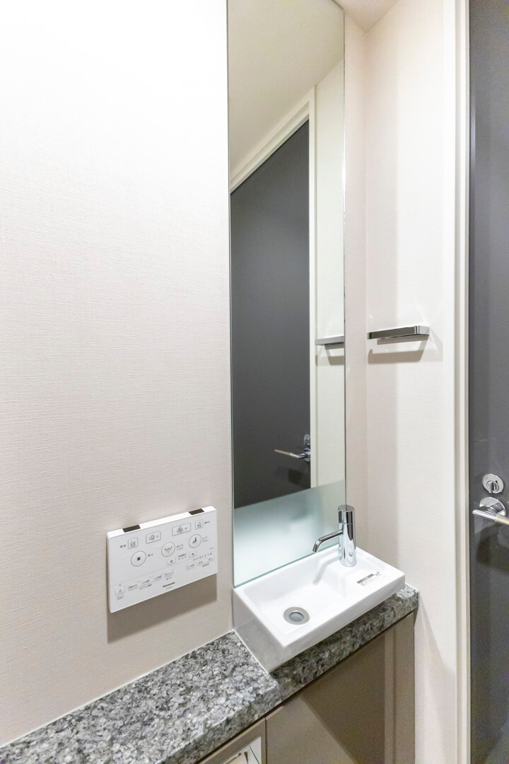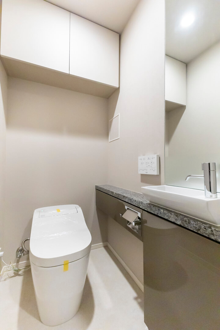 廊下に面していて独立性の高いレストルーム。スタイリッシュなタンクレストイレに交換済みです。手洗いカウンター付きなのですぐに手を洗うことができ、ゲストを洗面室まで案内する手間がかかりません。トイレットペーパーや掃除用品は吊戸棚に収納してください。