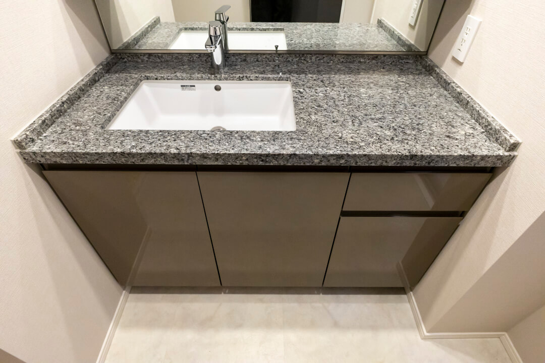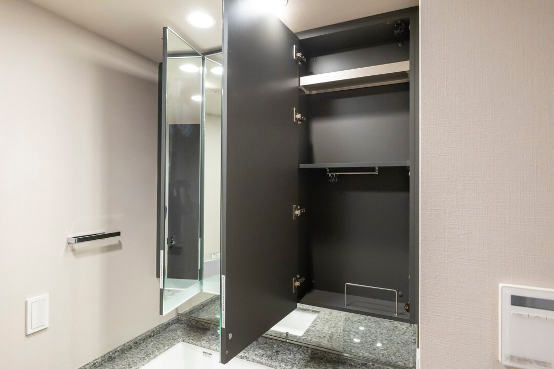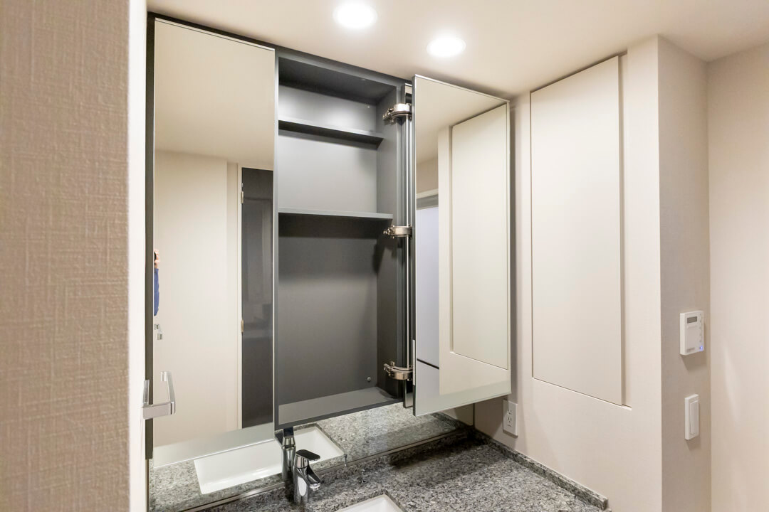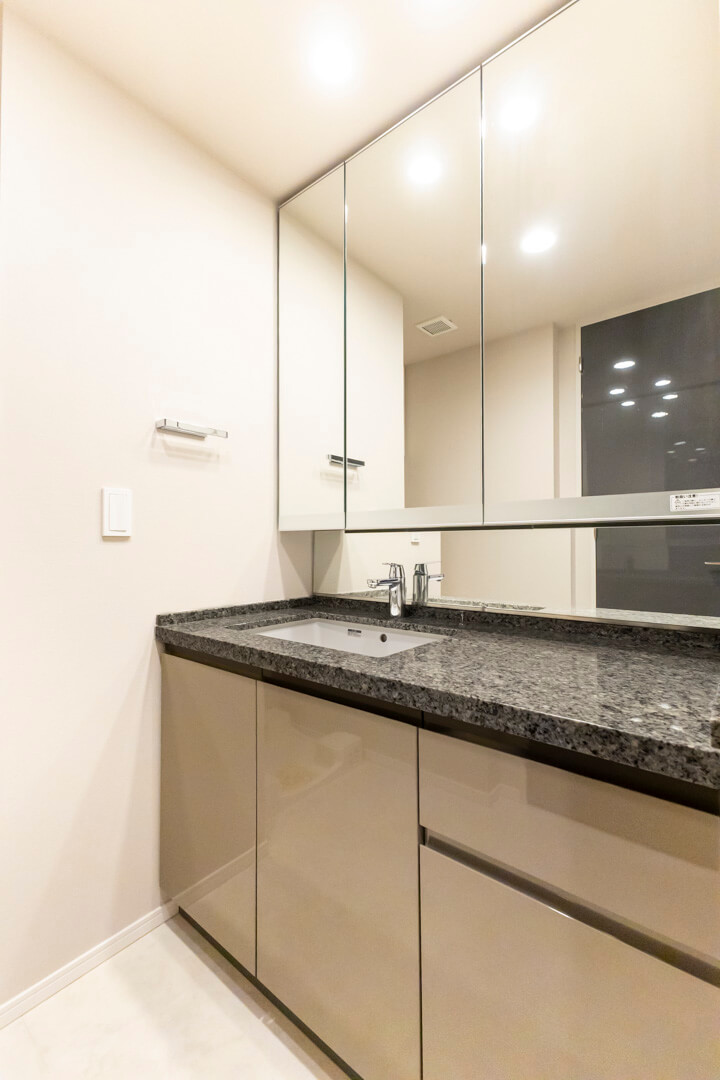 石目調カウンターが高級感を醸し出す洗面化粧台。大きな三面鏡&ミドルミラー付きです。洗面ボウルが片側に寄せられていて、カウンタースペースが広く確保されています。化粧品やドライヤーの仮置きができ、忙しい朝の身支度がスムーズに行えそうですね。ミラーボックスや壁面収納も付いていて、洗面まわりの小物をすっきり収納できます。