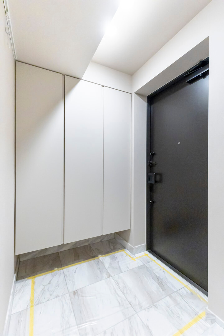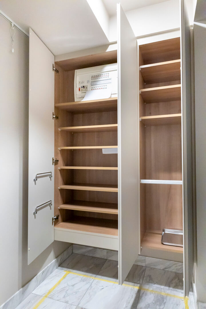 人感センサー搭載でいつも明るく出迎えてくれる玄関。荷物で両手が塞がっている時や夜遅く帰宅した時に、スイッチを探す手間がかからず助かります。入って右手には大容量のシューズボックスを完備。自由度の高い可動棚で、靴はもちろん、傘も収納できます。