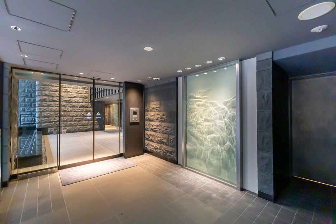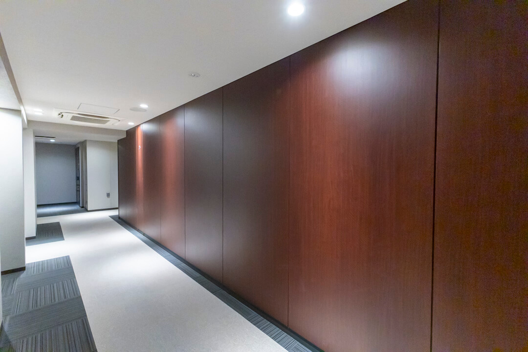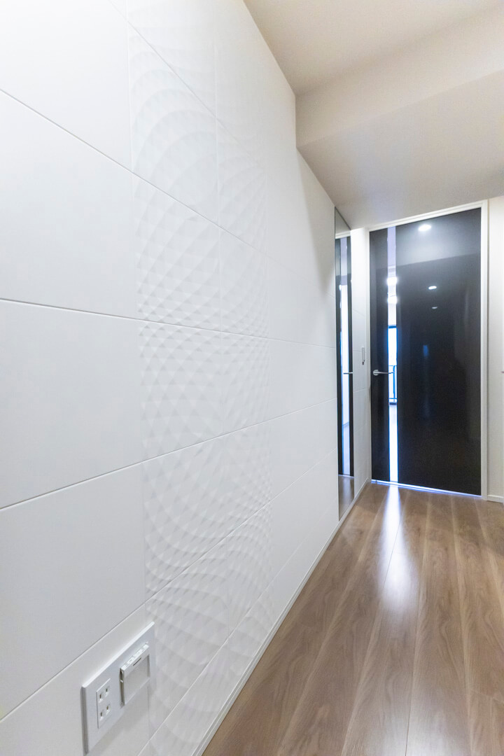 廊下にはエコカラットを設置。幾何学的なレリーフ柄でスタイリッシュな印象です。調湿・脱臭機能も備わっていて、快適な空間を実現します。