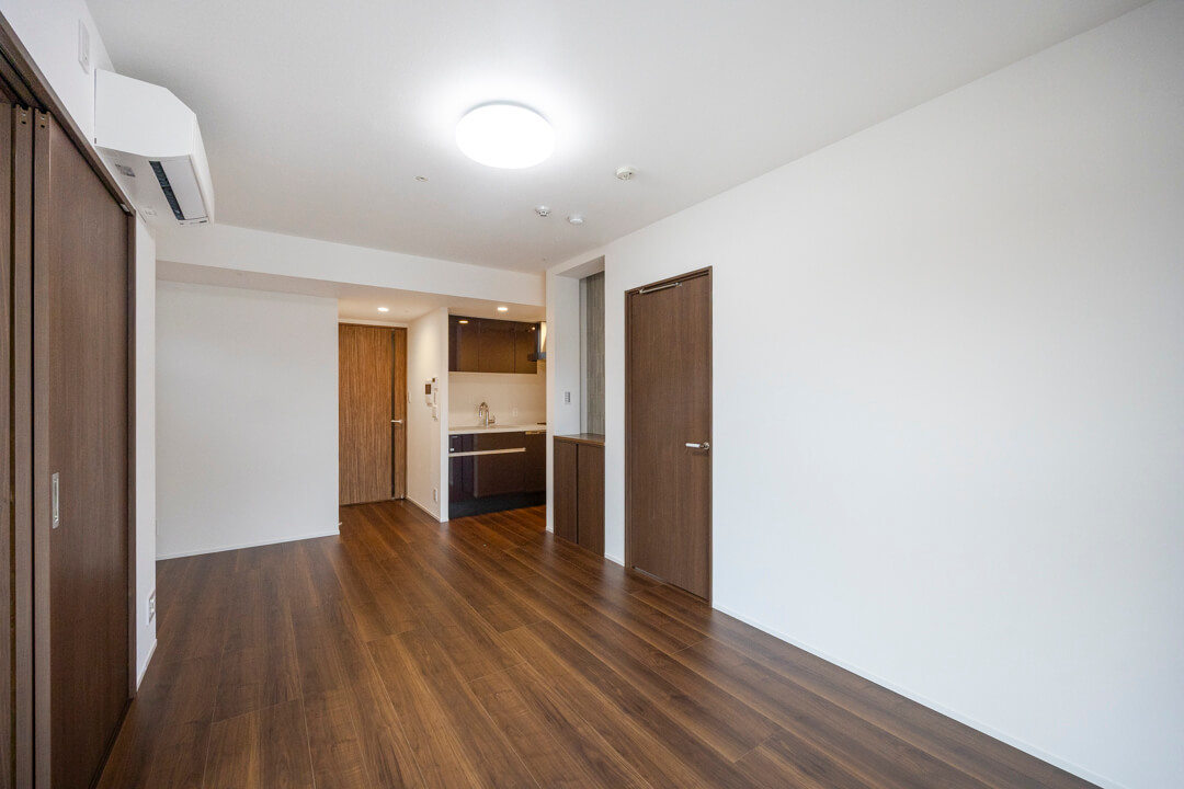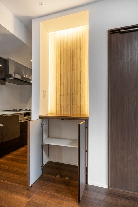 キッチンスペースを含め、約14.0帖のLDK。隣接している洋室と繋げてより広々と過ごせます。リビングの一角には間接照明付きのカウンターが備わっており、アートや季節の花を飾って空間に彩りをプラスできます。また、窓も大きく開放的。見晴らしも良好です。