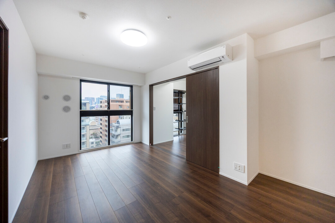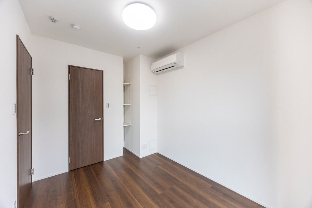 リビングダイニングと隣接した約4.5帖の洋室。扉の開口部が広く取られており、全開にするとリビングと繋げてより広々と過ごせます。大きな窓付き開放的。可動棚も設置されています。ワークスペースや趣味部屋などにも使いやすいお部屋です。