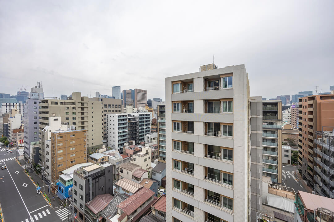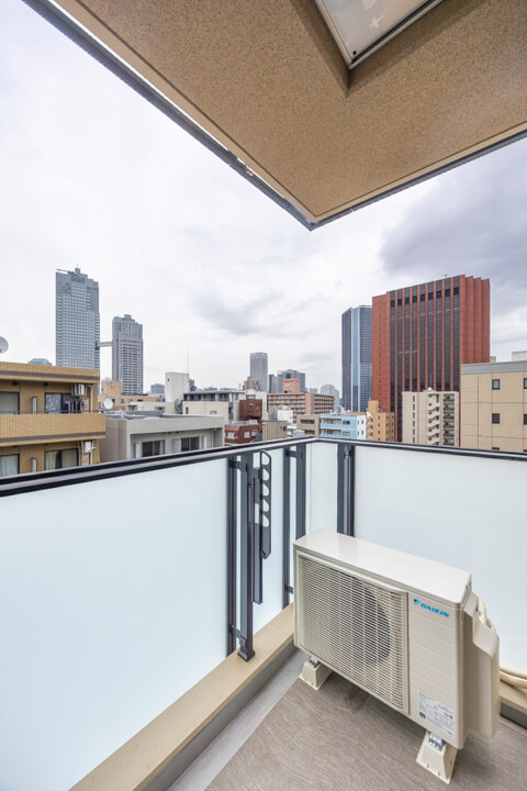 洋室(約4.5帖)から出入りできるバルコニー。北東向き、約4.29㎡程の広さです。11階部につき見晴らし良好です。