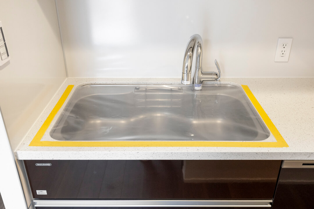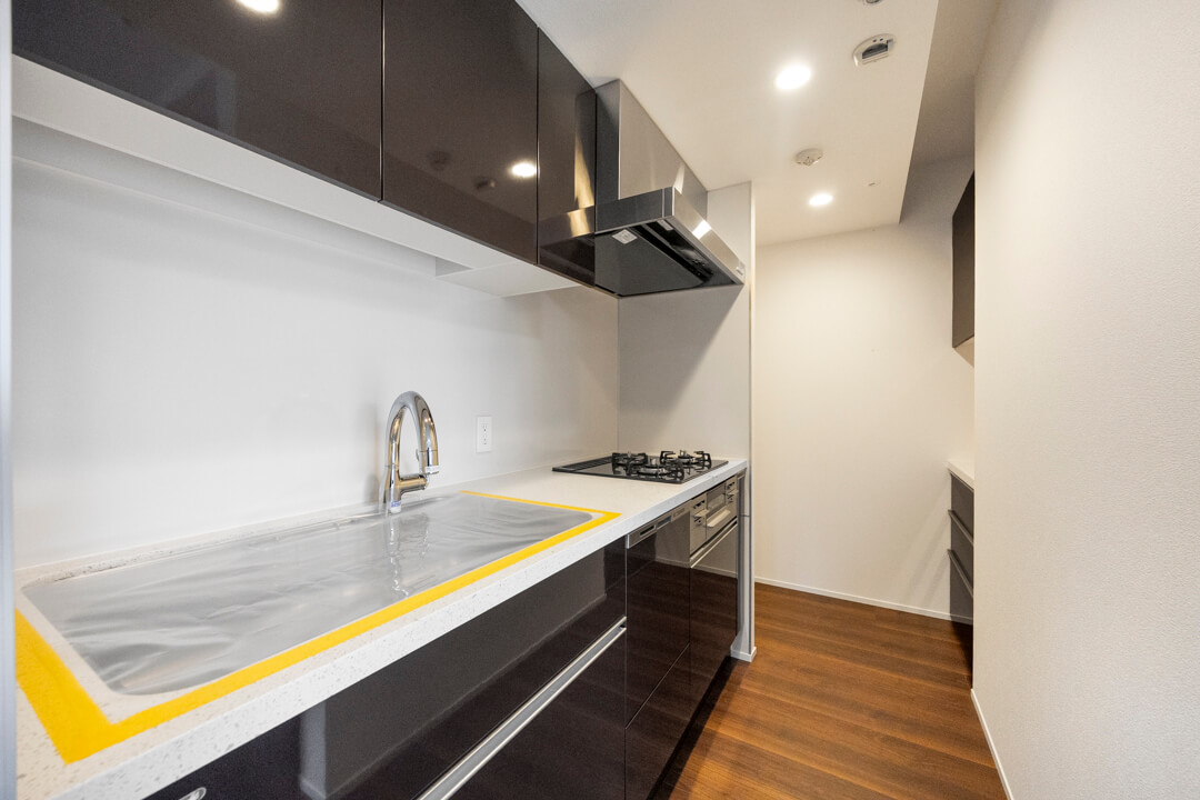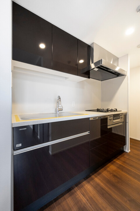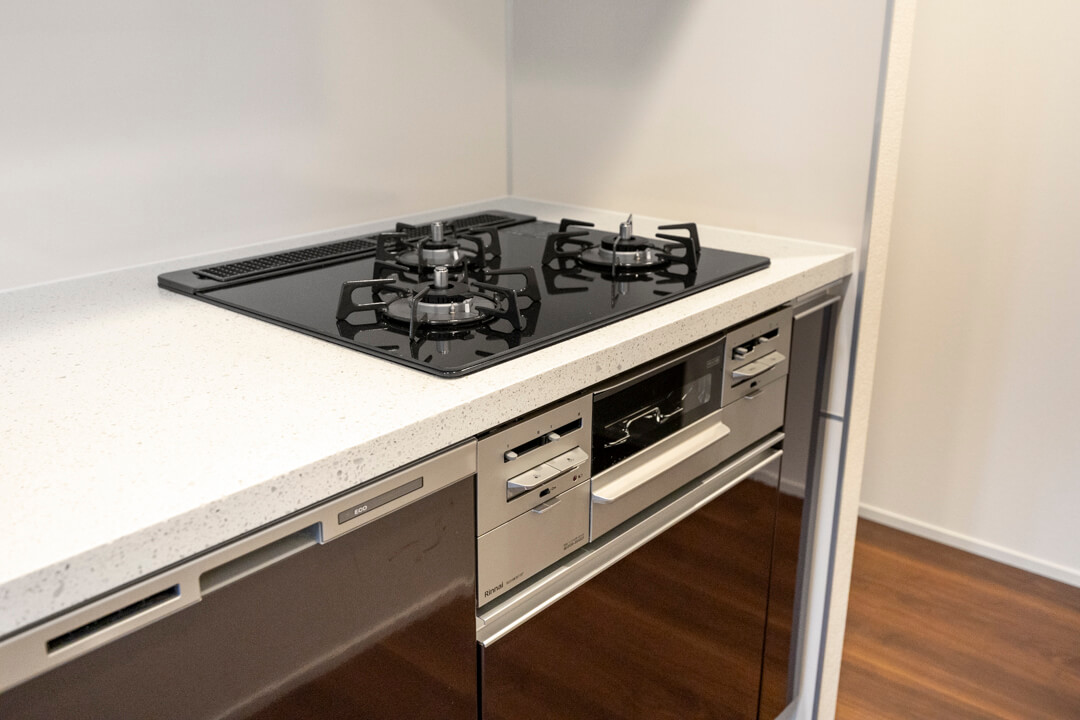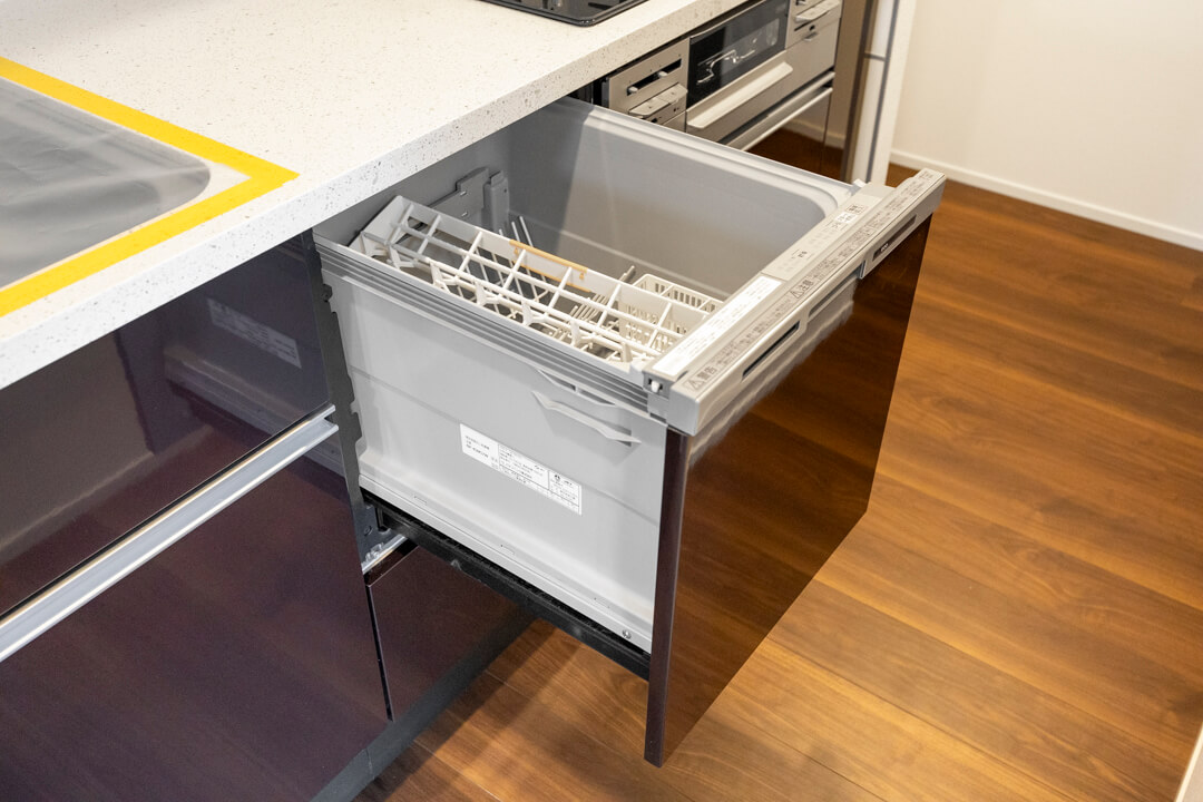 リビングダイニングと空間分けされたキッチンスペース。キッチン内が見えにくくなっているので、生活感をさりげなく目隠しできます。料理が捗る3口ガスコンロ、家事の時短に心強い食洗機付き。キッチン奥にはカップボードも備わっています。