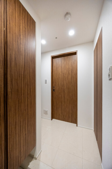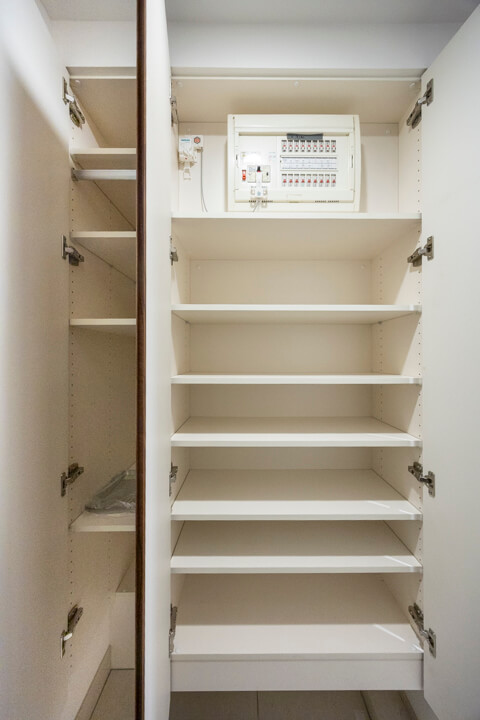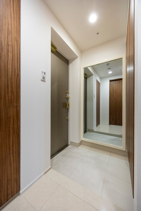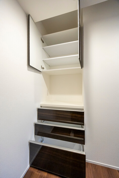 玄関・廊下には2つのシューズボックスが備わっていて収納充実。靴やペット用品、生活雑貨などが収納できます。また、玄関には大きな姿見付きで、お出かけ前の身だしなみもチェックできます。