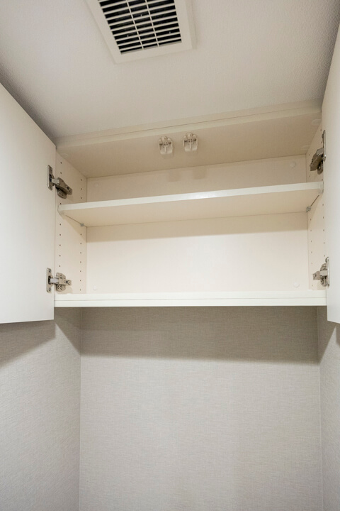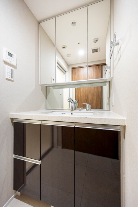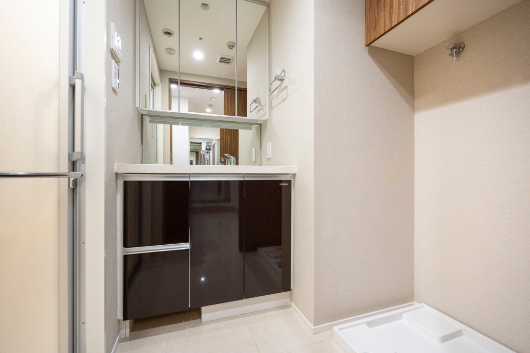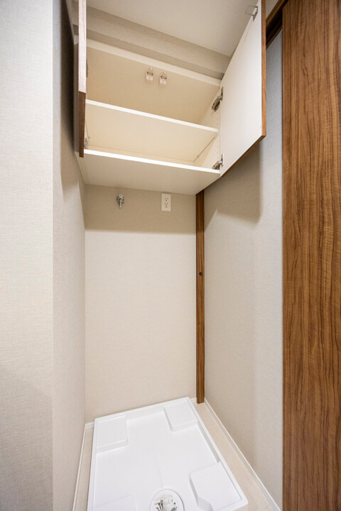 洗面化粧台は洗面まわりの小物がすっきり整頓できるミラーボックス付きでいつでも整った状態をキープできそうです。洗濯機置き場の上部にも収納スペースが備わっています。