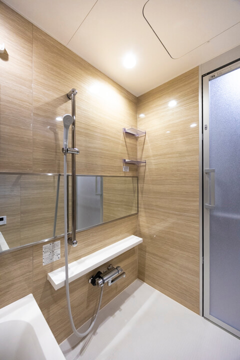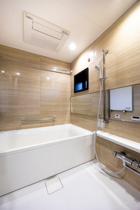 ウッド調であたたかみのある雰囲気のバスルーム。追い炊き機能の他、ミストサウナ・換気・暖房・乾燥の4つの機能が備わっており、一年中快適にバスタイムが楽しめます。ランドリーパイプも付いていて雨の日や冬場の洗濯にも困りません。小窓付きで換気もスムーズに行えます。