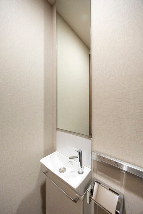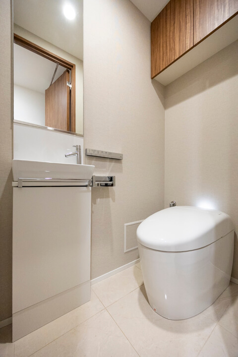 廊下に面したレストルーム。空間がすっきり見えるタンクレストイレです。独立型の手洗い器、収納スペース付き。ウォシュレットリモコンはスティック型でスタイリッシュです。