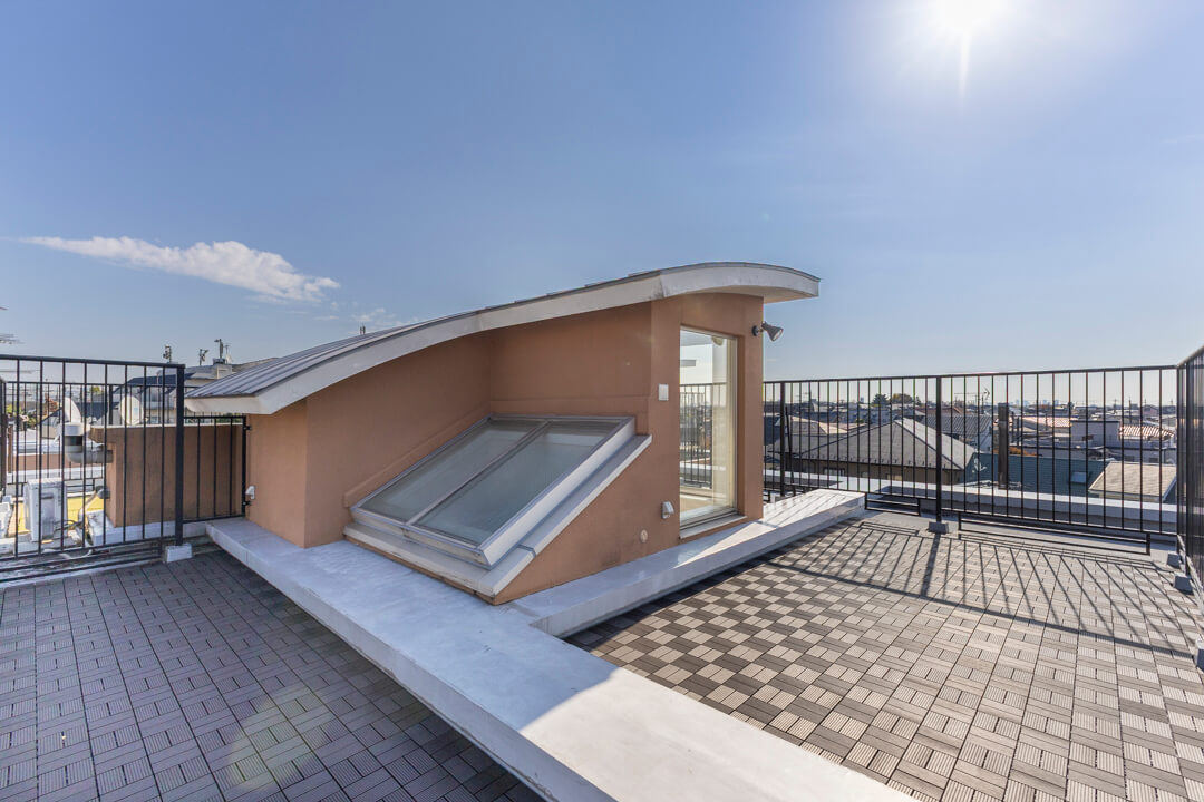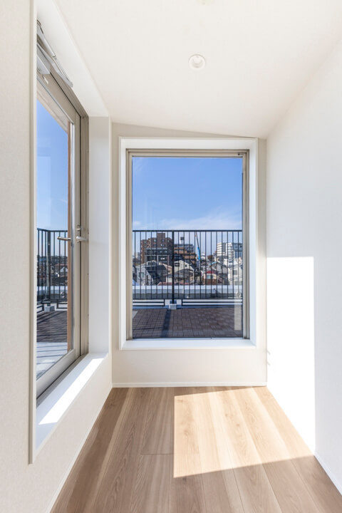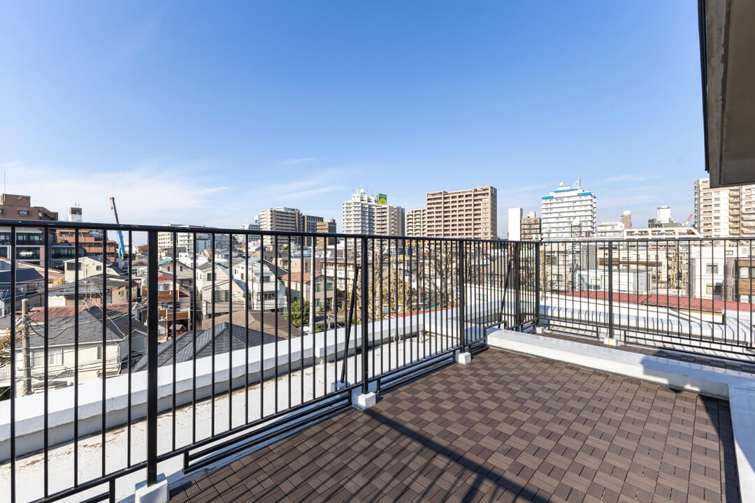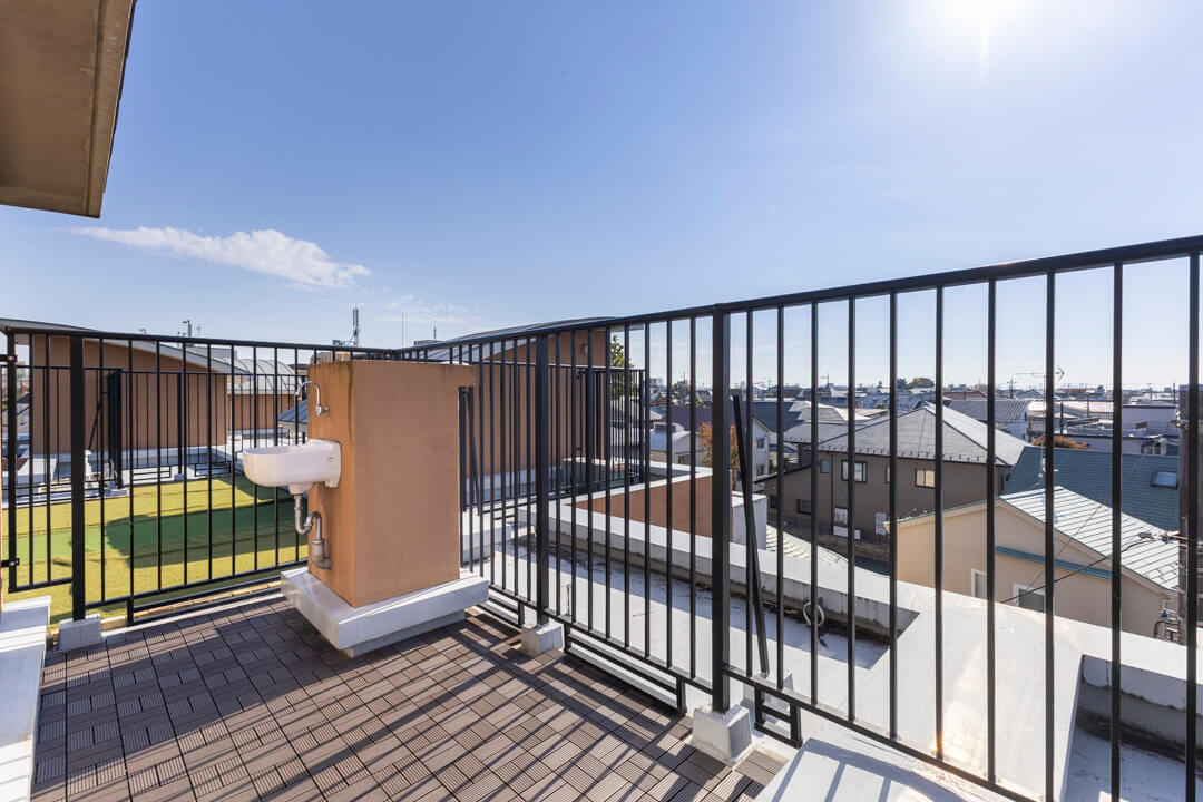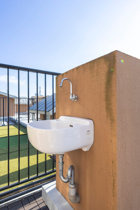 屋上には約41㎡のルーフバルコニーがあります。あたたかい太陽光がたっぷり届く、開放感溢れる空間。テーブルやチェアを置いて休日のブランチを楽しんだり、ヨガやストレッチといった運動をしたり。戸建て感覚で楽しめて、家族の憩いの場所になりそうです。お花の水やりや掃除に便利なスロップシンク付きなのも嬉しいポイントです。