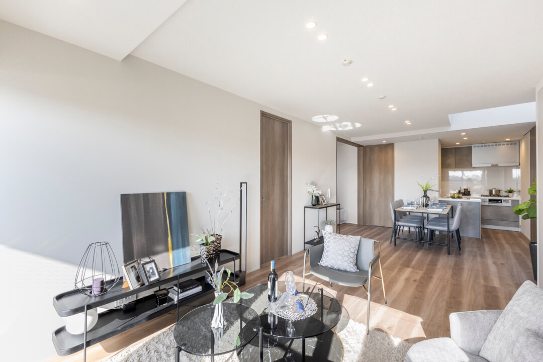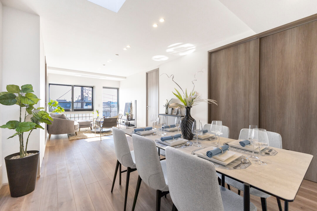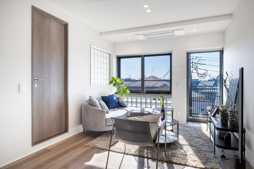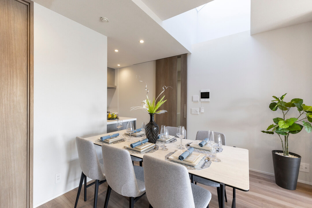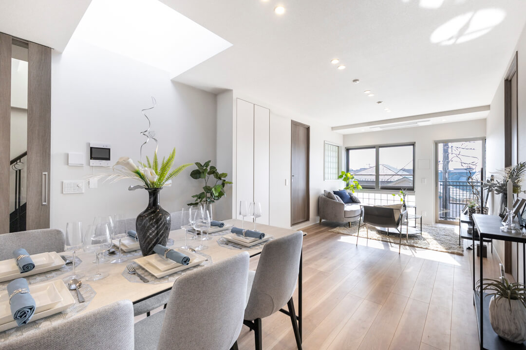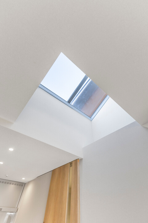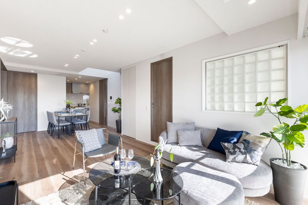 約18.5帖の広々としたLDK。南向きの窓から自然光が降り注ぐ、明るい空間です。ガラスブロック&天窓も採用されていて、プライバシー性を確保しながら光を取り入れることができます。スタイリッシュなビルトインエアコン完備なのも嬉しいポイントです。