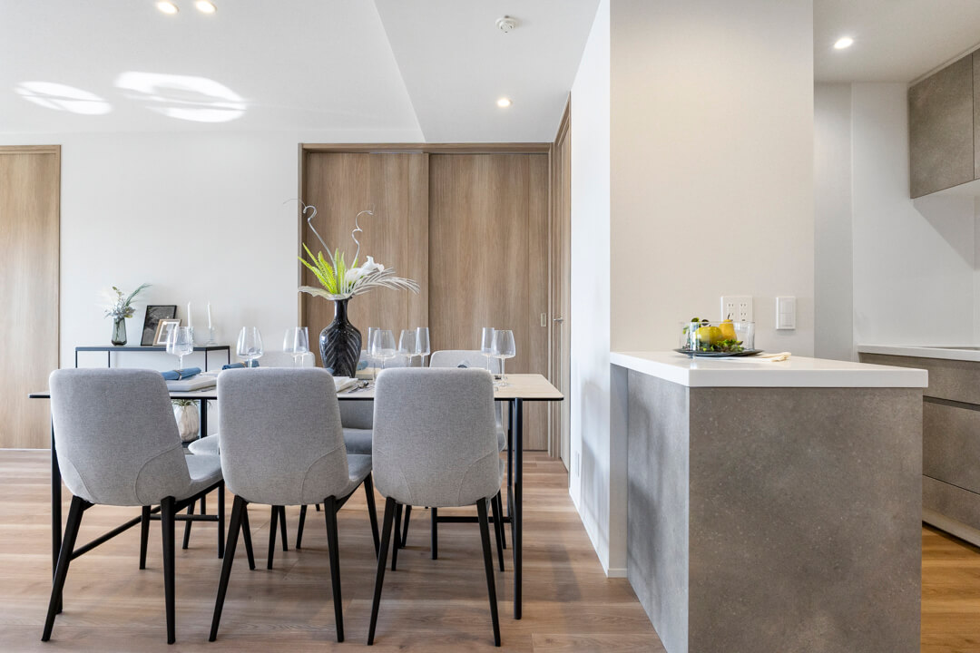 キッチン背面にはカウンター収納を設置。キッチンと同じデザインで統一感があります。完成した料理や使い終わったお皿をカウンターに置けば、運ぶ手間が省けますね。冷蔵庫置き場はリビング側から見えない位置にあり、生活感をさりげなく目隠しできるのがポイントです。