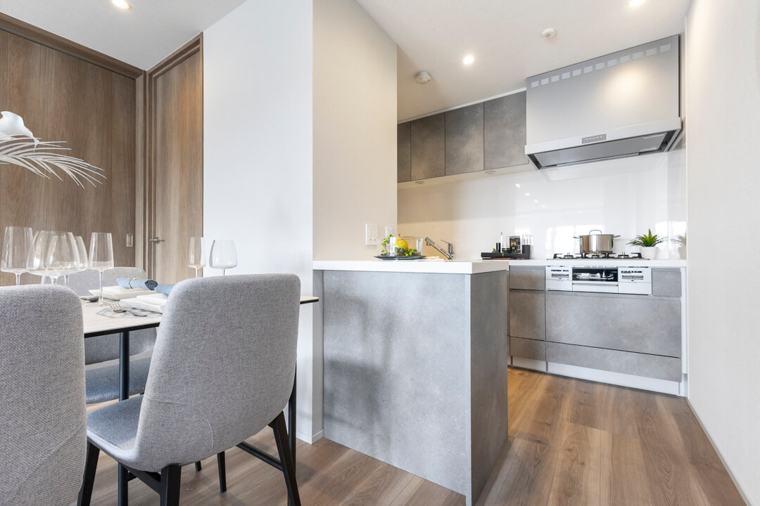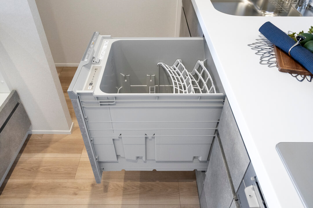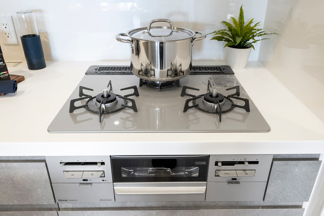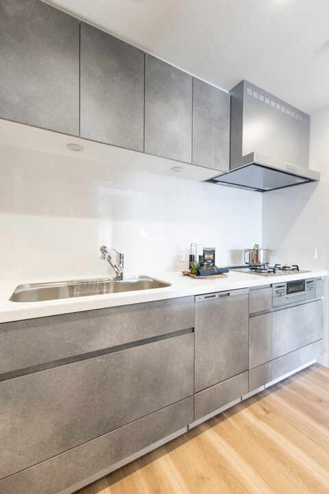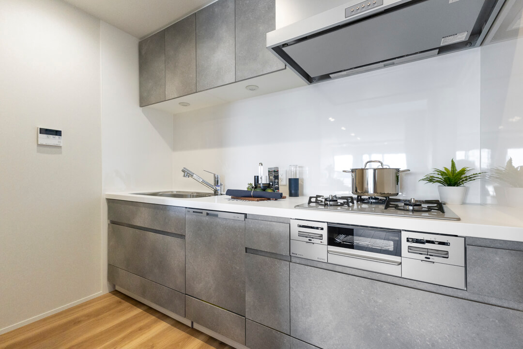 調理に集中できる壁付けキッチン。グレー基調でスタイリッシュな印象です。グリル付3口ガスコンロ・食洗機内蔵で、調理も後片付けも捗りそう。浄水器一体型水栓も設置されているので、調理の際に手軽においしい水を使用できます。