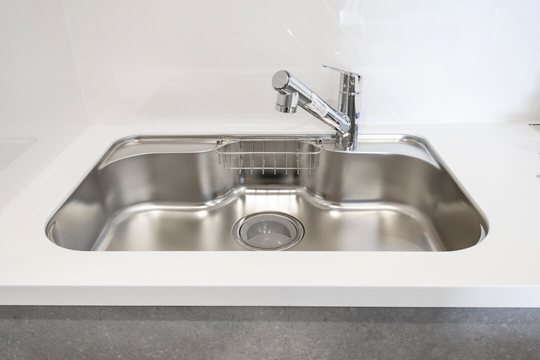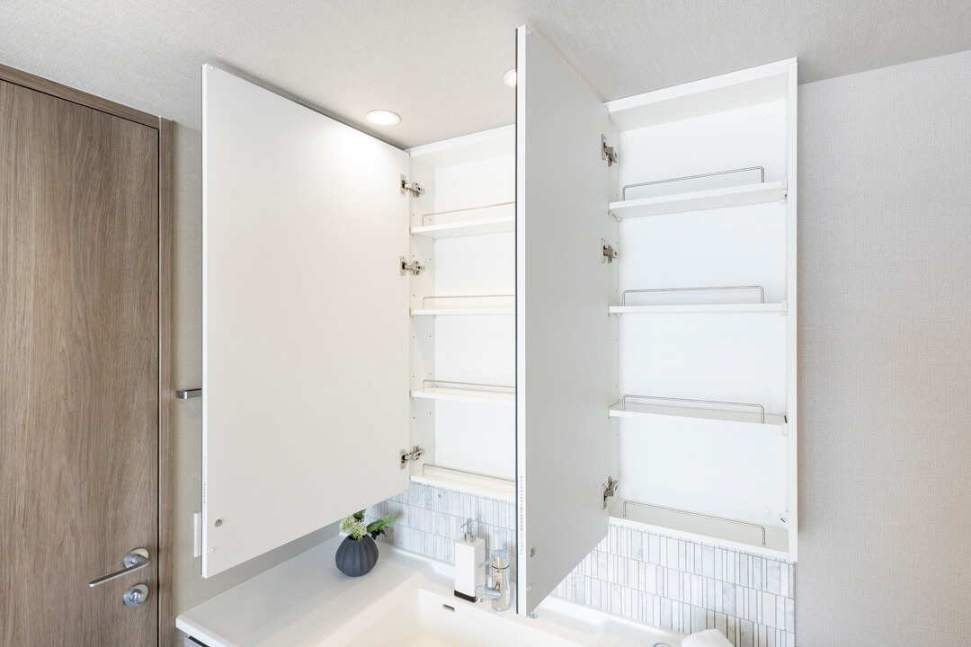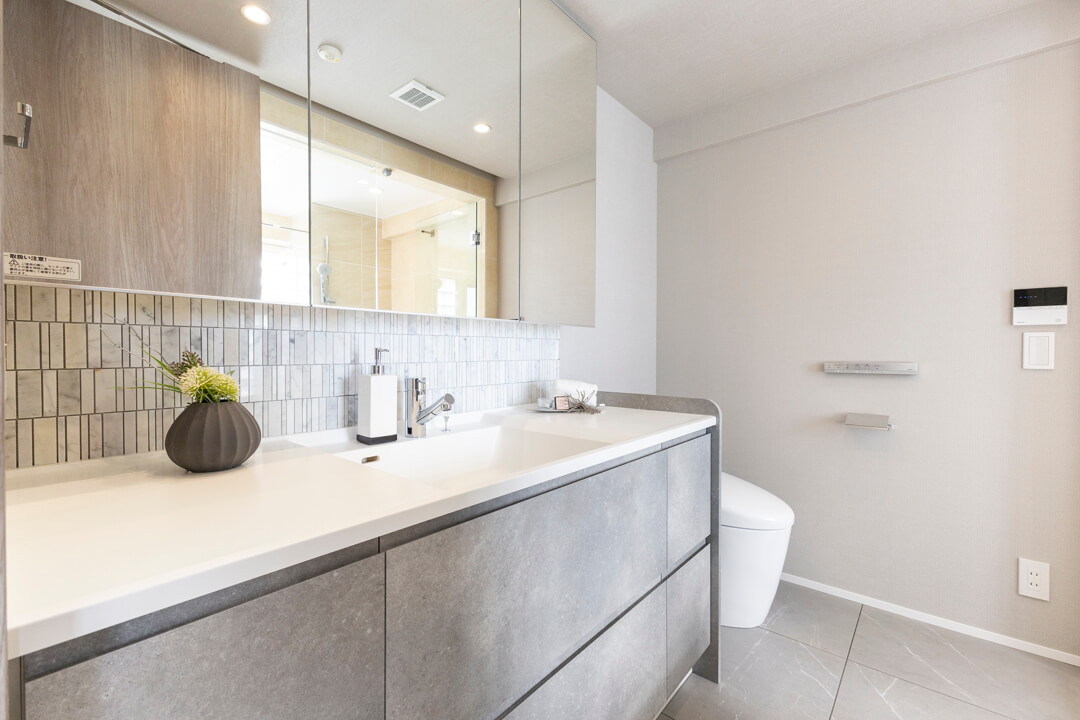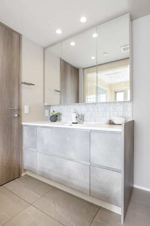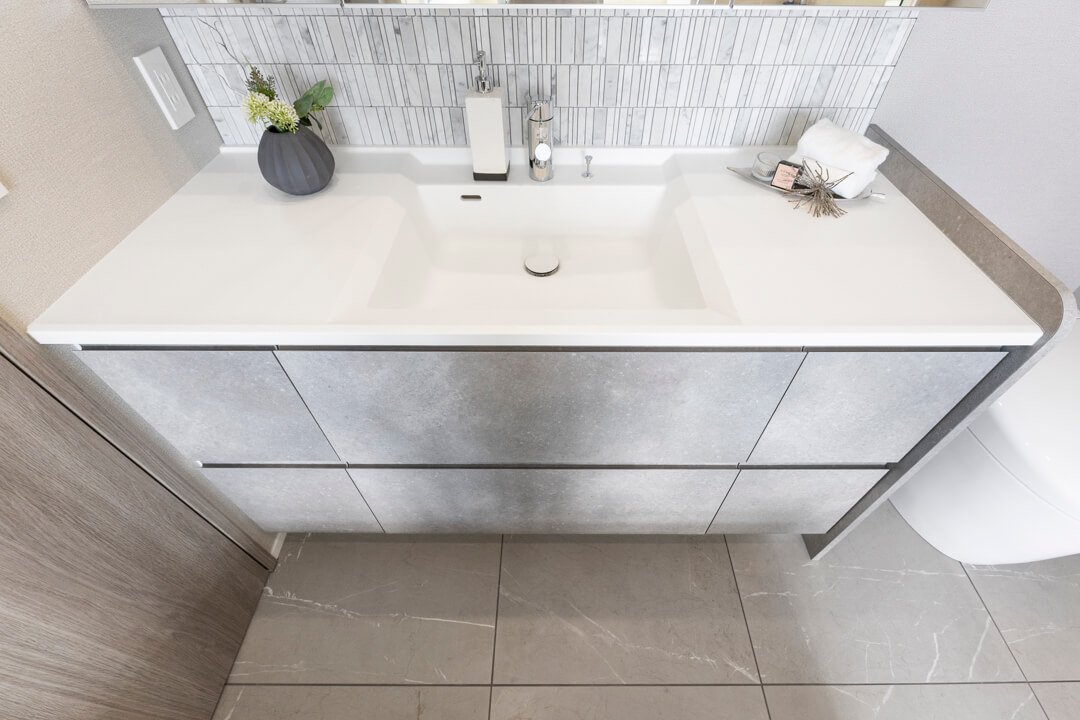 洗練されたデザインが印象的な洗面化粧台。大きな三面鏡付きで身だしなみを整えるのに便利です。カウンタースペースにはゆとりがあり、化粧品やドライヤーの仮置きが可能◎。忙しい朝の身支度も落ち着いて行えそうですね。洗面ボウルと一体成型なので汚れが溜まりづらく、お手入れしやすいのも嬉しいポイントです。