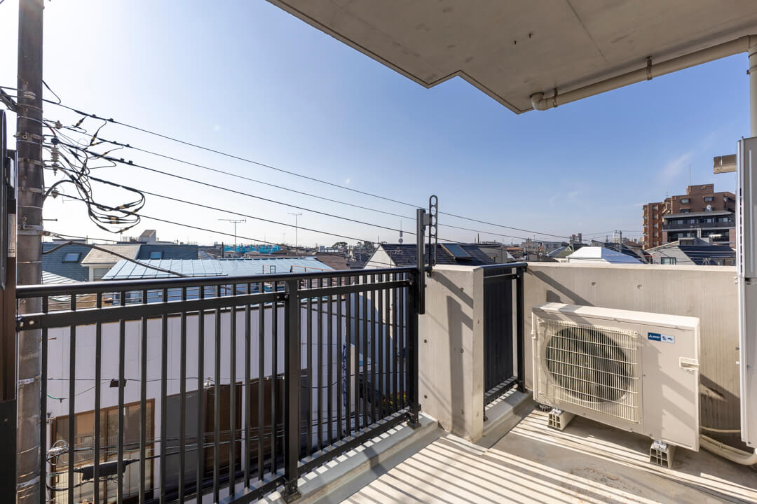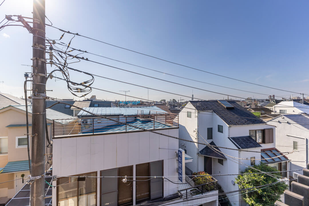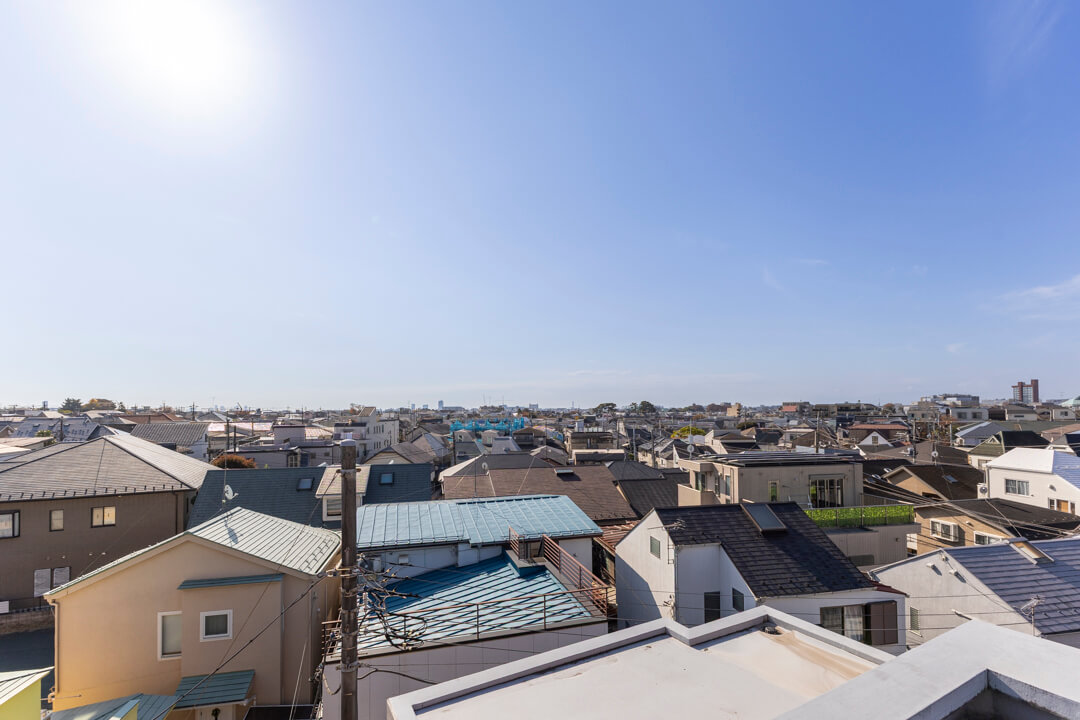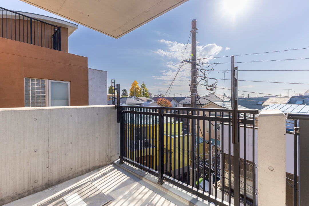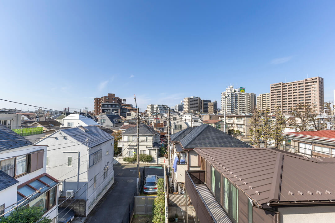 LDKと洋室1に面するバルコニー。あたたかい光が届く南向きです。晴れの日には洗濯物がよく乾きそうですね。周辺には低層住宅が多く、青空を見渡す開放感ある眺めが魅力です。