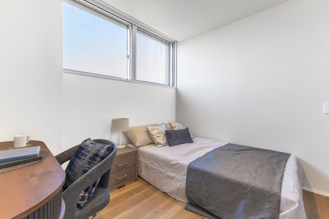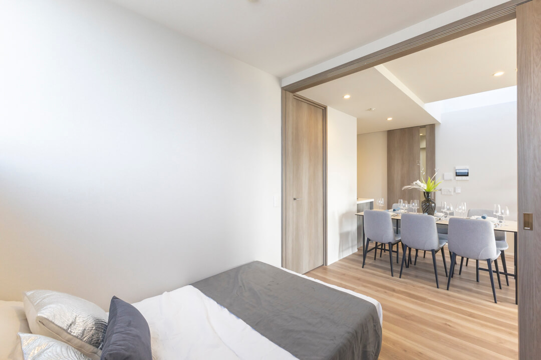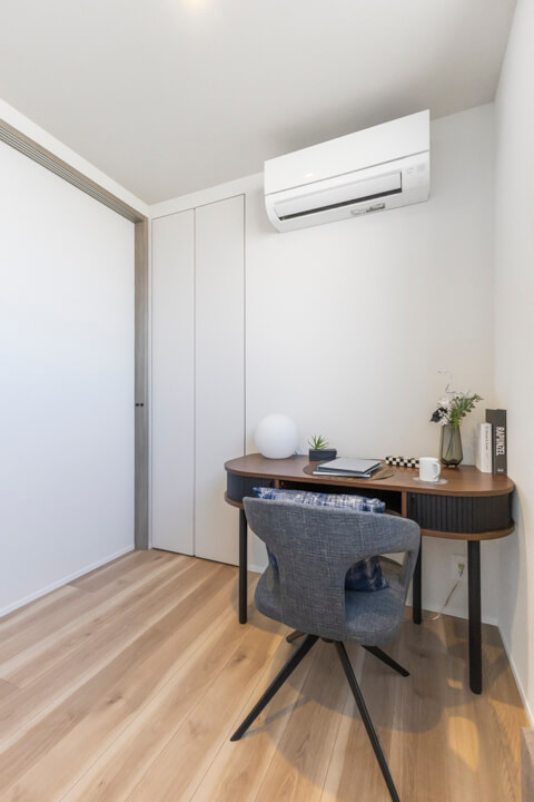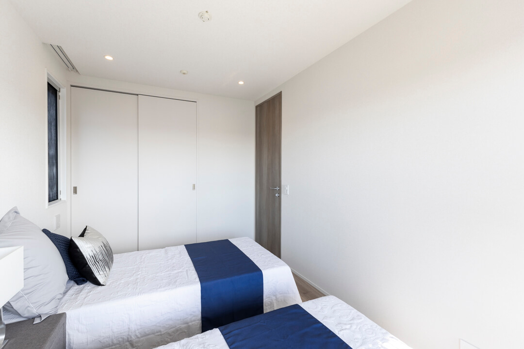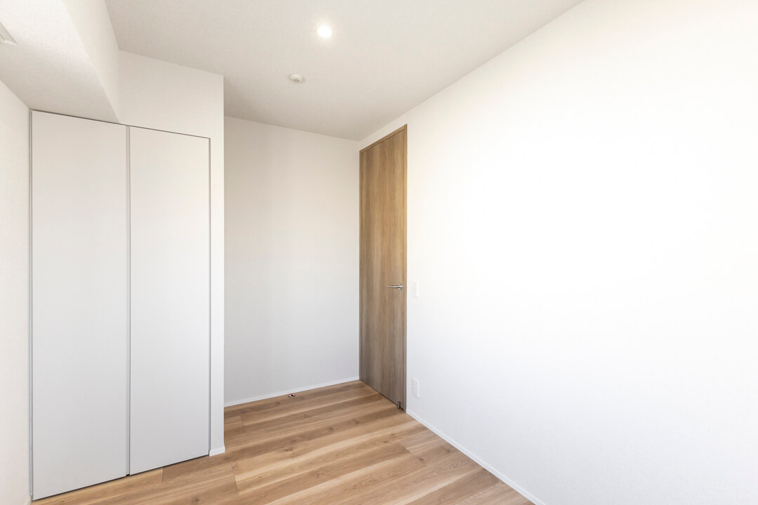 約4.5帖の洋室2。西向きの窓とクローゼット付きのお部屋です。LDKとは引き戸で仕切られているので、普段は扉を開放してゆったり過ごし、ゲストが来た時は扉を閉めてプライベート空間を隠すといった使い方も◎。床にレールがなくフラットで開放的です。