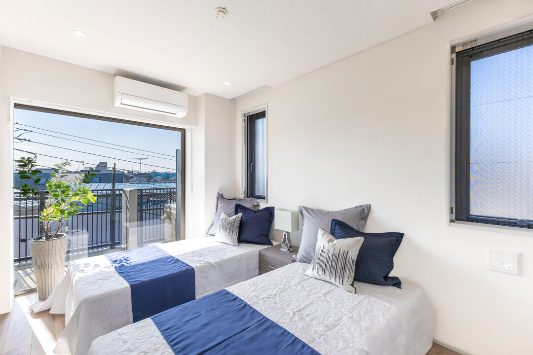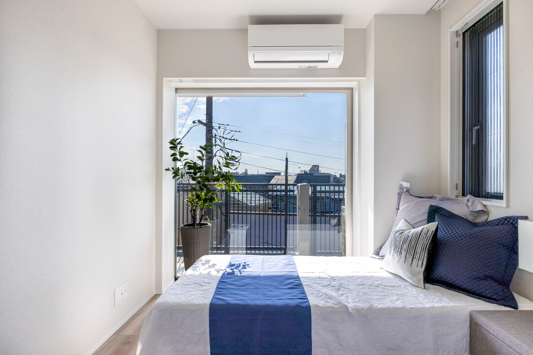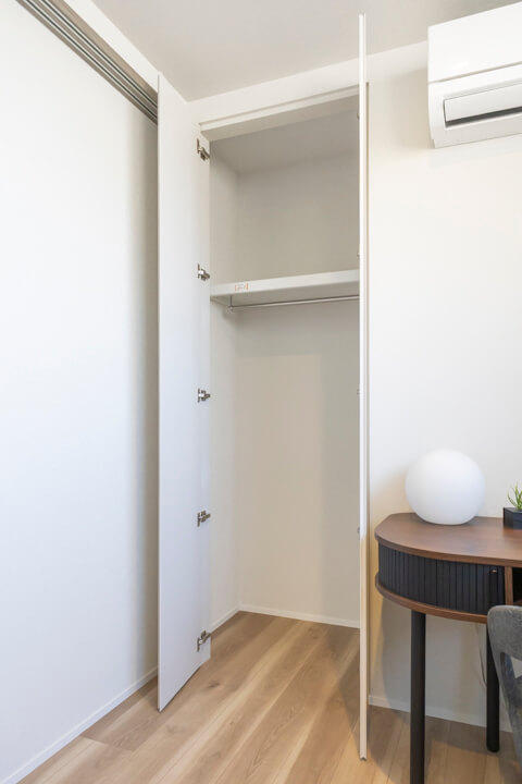 約6.2帖の洋室1。バルコニーに面していて開放感があり、主寝室にぴったりです。南西2面採光で日当たり・風通しの良さが魅力的ですね。クローゼットには引き戸を採用していて、開閉時にスペースを取らないのも嬉しいポイントです。