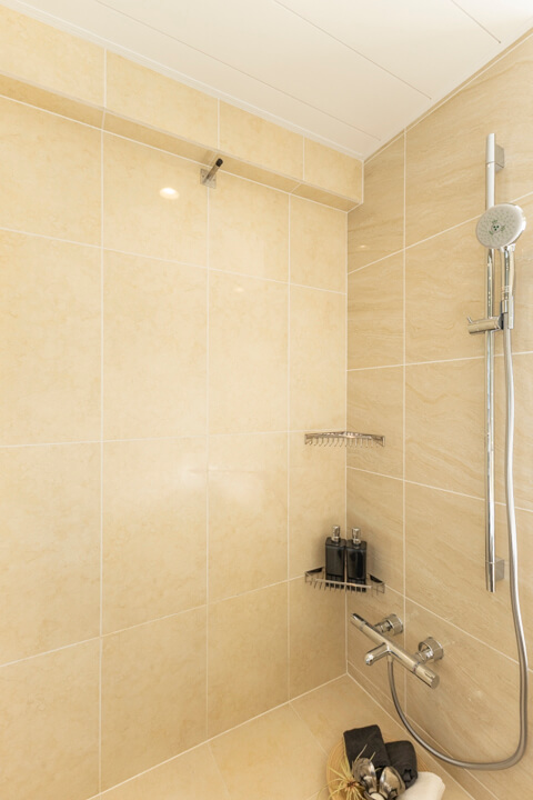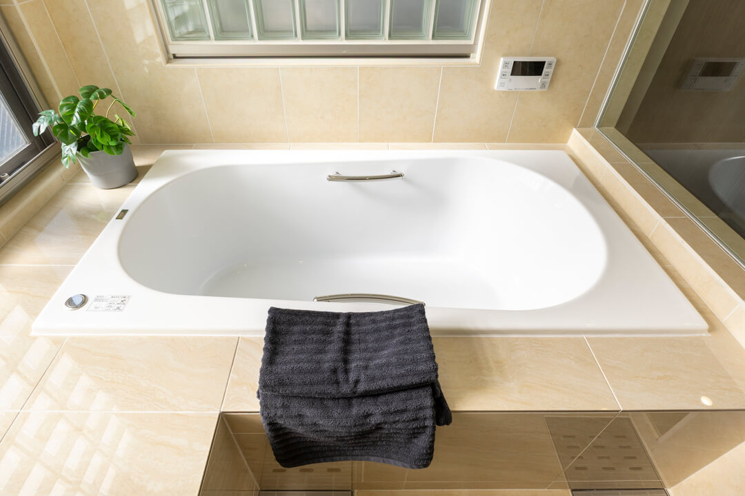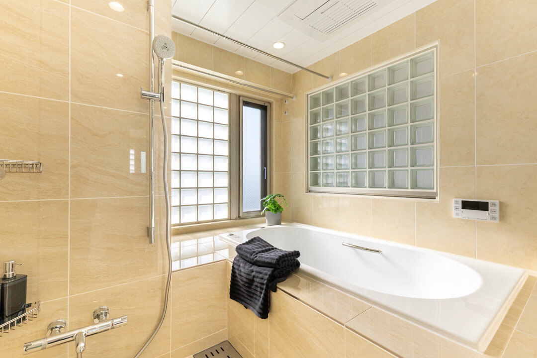 ガラスブロックからやわらかな光が入るバスルーム。明るいタイルデザインでホテルライクな雰囲気が漂います。換気・暖房・乾燥・涼風機能付きで1年中快適なバスタイムに。雨の日の洗濯スペースとしても重宝しそうです。追い焚き機能も付いているので、家族の入浴時間がずれてしまった時、半身浴をしたい時に便利です。