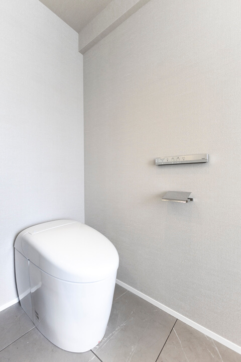 トイレは洗面室内にあります。TOTO製の洗浄機能付トイレに交換済み。タンクレス仕様ですっきりとした印象です。便フタは自動開閉式なので、直接触れることなく使用できて衛生的です。