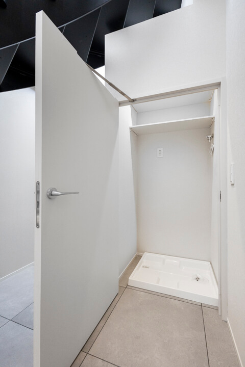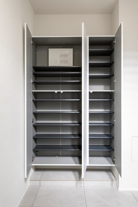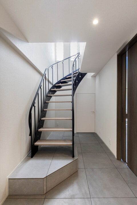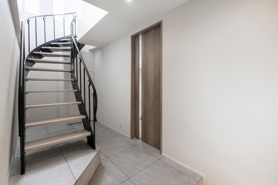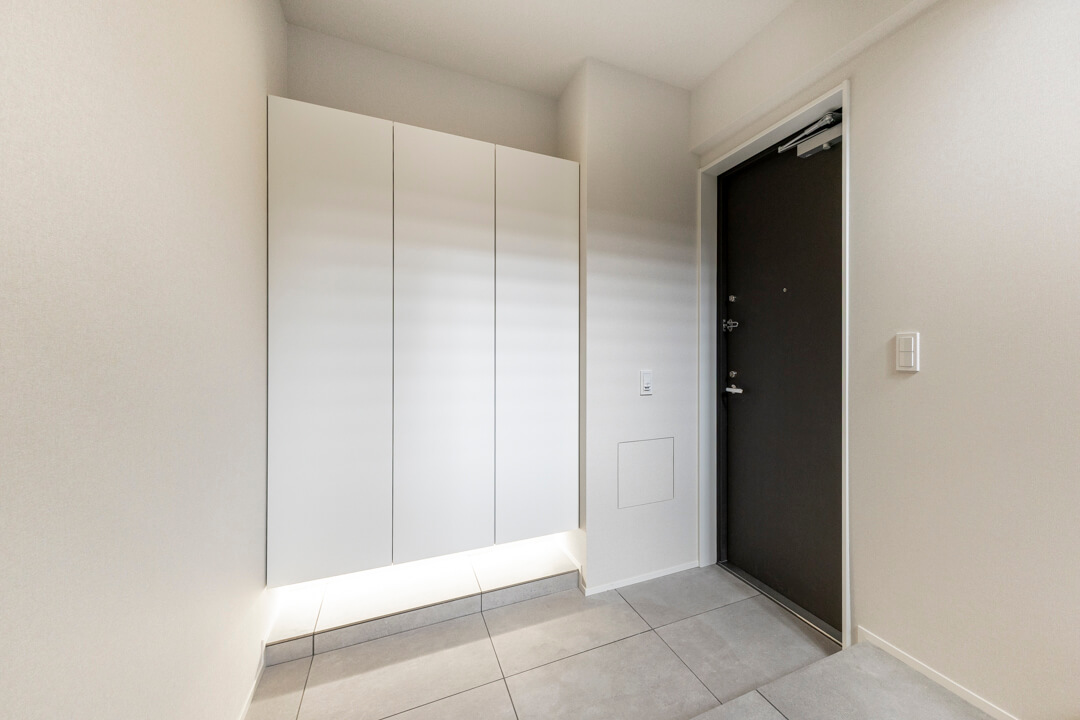 専用屋上に続く階段があり、光が降り注ぐ玄関スペース。自動点灯式の照明が付いていて、いつも明るく出迎えてくれます。荷物で両手が塞がっている時や夜遅く帰宅した時に、スイッチを探す手間がかからず助かりますね。大容量のシューズボックス完備で、いつも清潔な空間をキープできそうです。