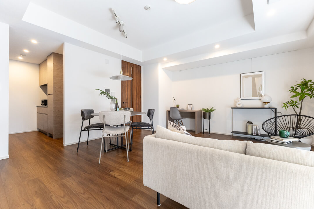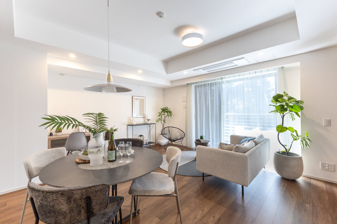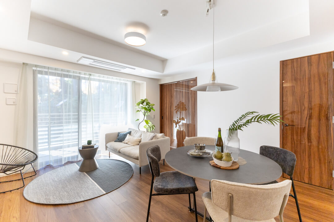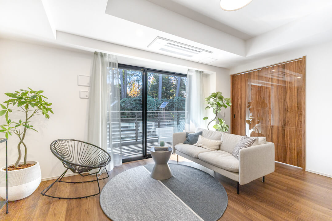 約16.8帖の広々としたLDK。南西向きの窓からは、あたたかな自然光がたっぷり差し込みます。バルコニーにも繋がっていて、窓の外には新宿御苑の豊かな緑が広がります。日常に落ち着きとゆとりをもたらす、心安らぐ時間を過ごせそうですね。
