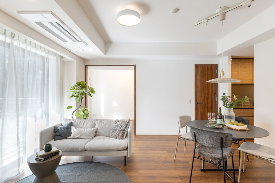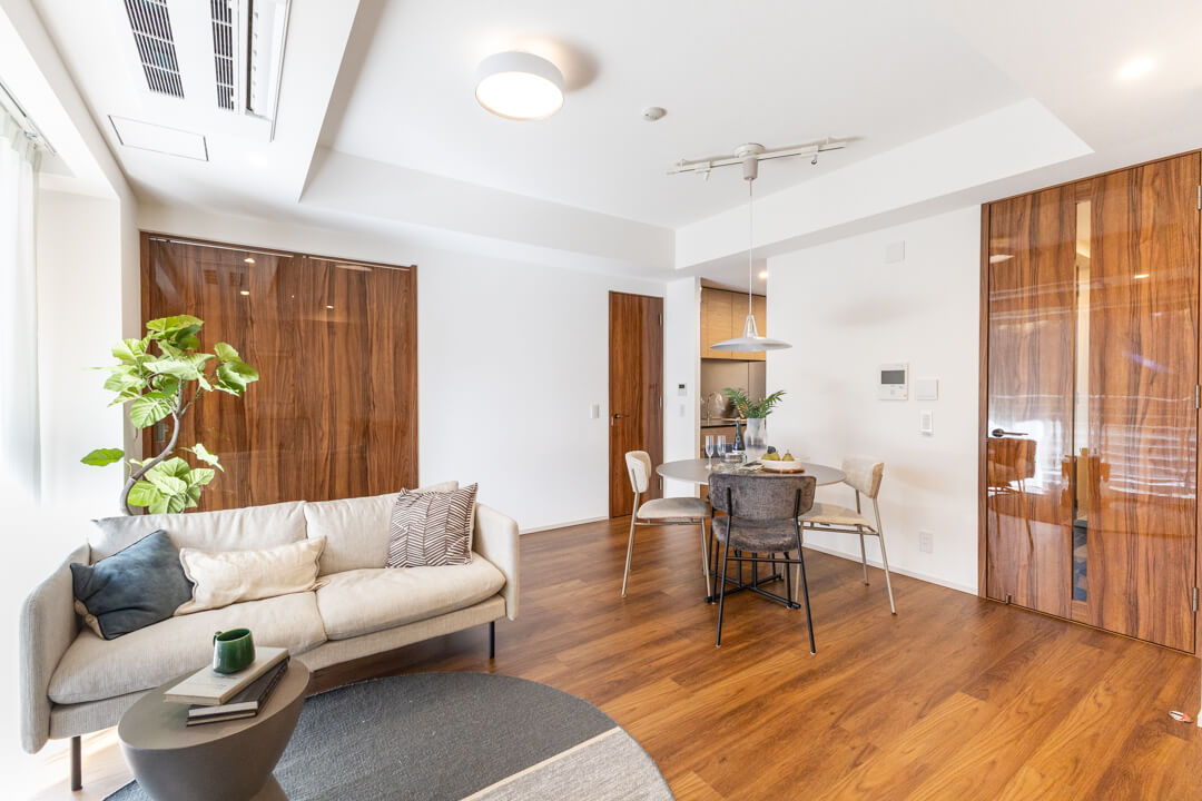 寒い時期に重宝する床暖房を完備。床全体がほぼ均一に温まるので、足元からじんわりと温まることができます。埃を舞い上げにくく、空気が乾燥しにくいのも嬉しいですね。直接火に触れる心配がないので、小さなお子さまのいるご家庭でも安心して使用できそうです。エアコンにはすっきりとした見た目のビルトインタイプを採用しています。