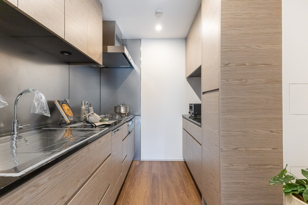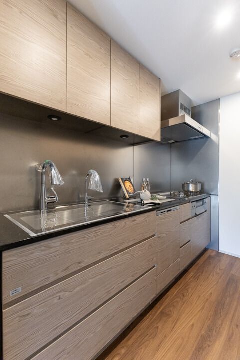 スタイリッシュなデザインの独立キッチン。調理に集中でき、生活感が出やすいキッチンまわりをさりげなく目隠しできます。調理中のにおいが生活スペースに広がりにくいのも嬉しいですね。