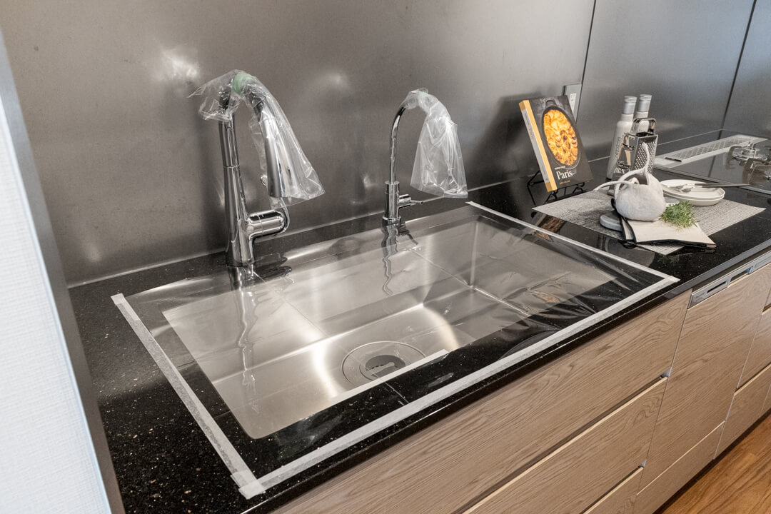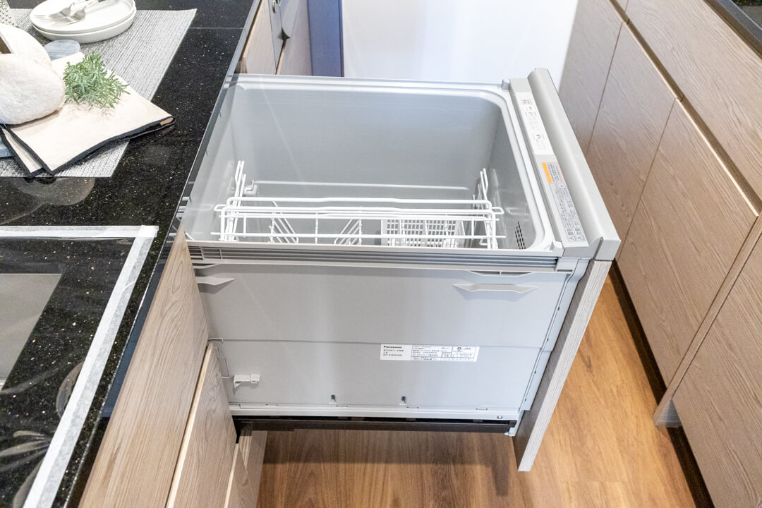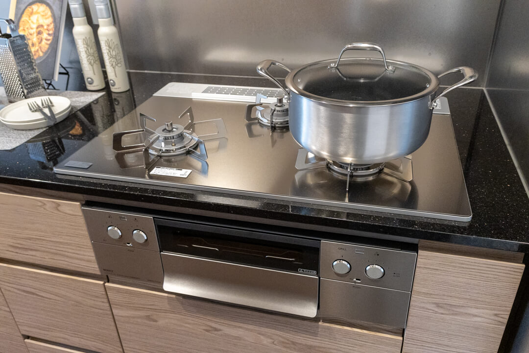 同時調理が叶うグリル付3口ガスコンロを内蔵。さらに、ディスポーザーと食洗機も完備されています。料理後すぐに生ゴミを処理できるので、悪臭の原因を防ぎ、掃除の手間を軽減。食器洗いも捗り、後片付けの時短が叶います。