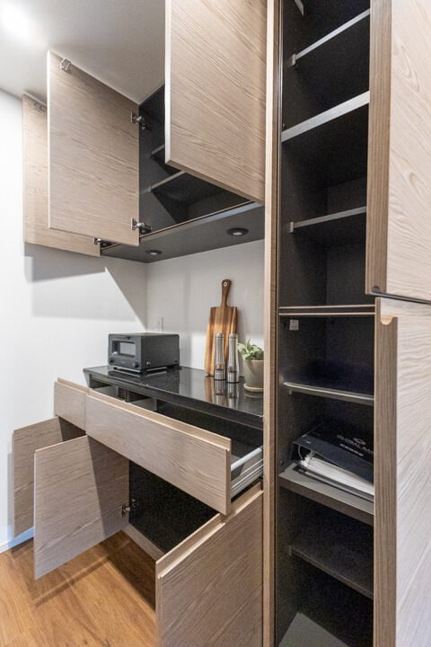 背面には収納力のあるカップボードを完備。キッチンと同じデザインで統一感があります。食料品のストックや食器類を整理整頓でき、ごちゃごちゃしがちなキッチンまわりがすっきり片付きそうです。カウンターにはコンセントが付いていて、炊飯器やコーヒーメーカーといったキッチン家電の使用に便利です。