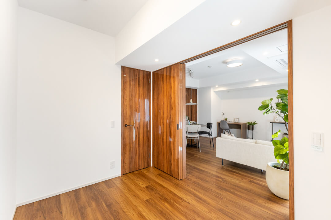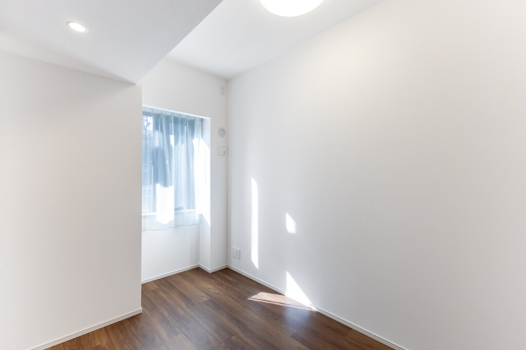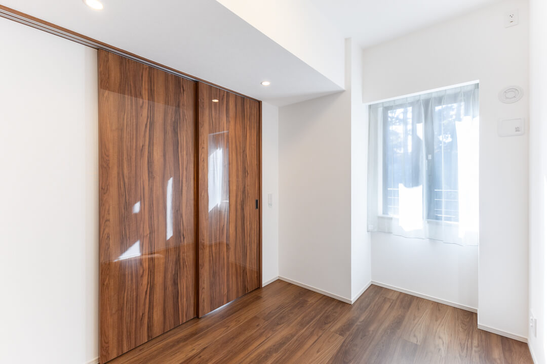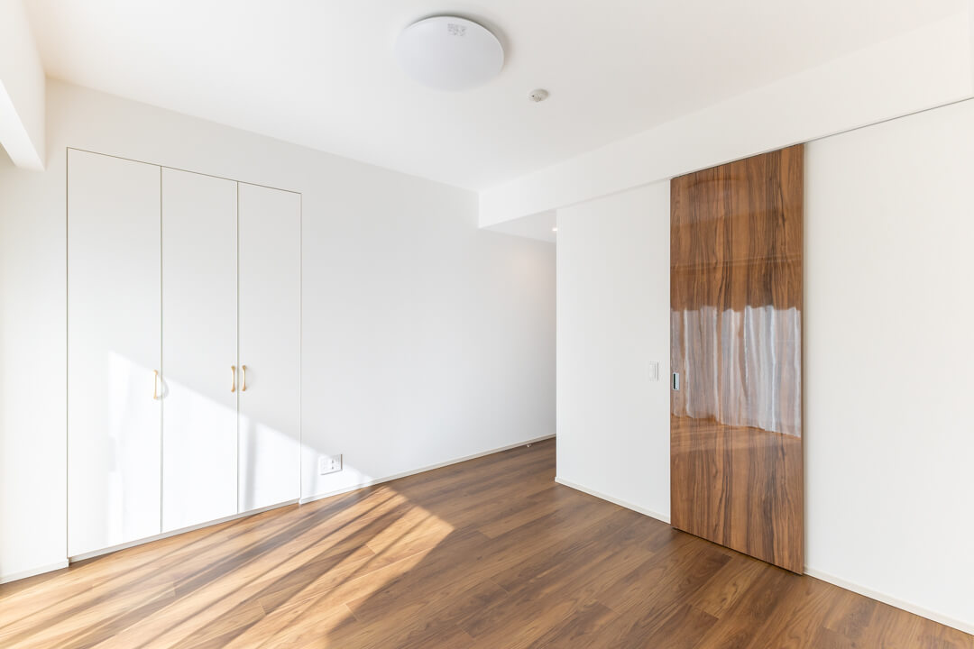 約5.0帖の洋室2。LDKとは引き戸で仕切られているので、フレキシブルに活用できます。扉を開放して拡張リビングにしたり、閉めてワークスペースやプライベート空間にしたり。ライフスタイルやシーンに合わせて使い分けてください。約0.5帖のWIC(ウォークインクローゼット)完備で収納スペースもしっかり確保されています。