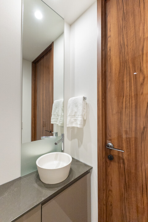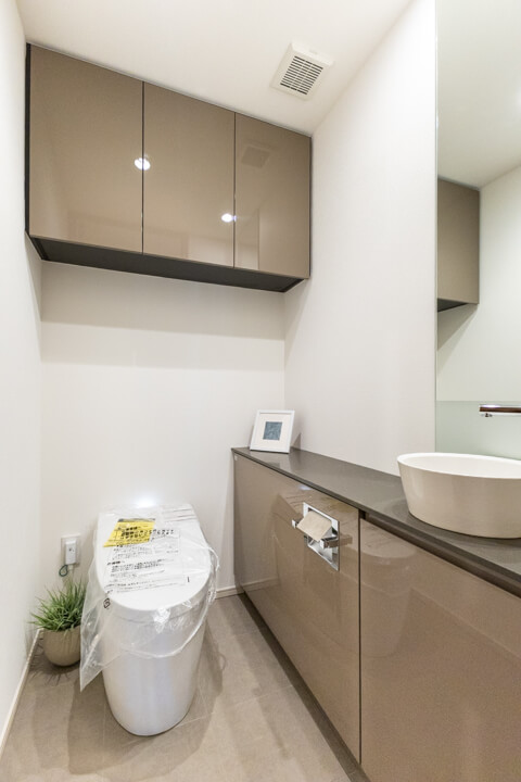 廊下に面していて独立性の高いレストルーム。TOTO製の洗浄便座付トイレに新規交換済みです。タンクレス仕様でスタイリッシュですね。手洗いカウンター付きなので、すぐに手を洗うことができて衛生的。照明には人感センサーが搭載されているので、消し忘れの心配がなく、節電効果が期待できます。