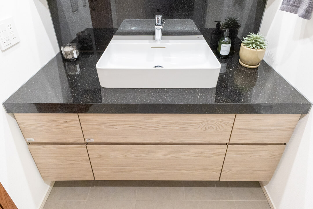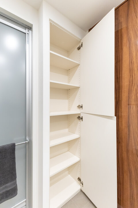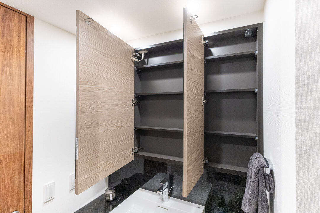 エレガントな印象の洗面化粧台。大きな三面鏡付きで身だしなみを整えるのに便利です。裏は収納棚になっていて、洗面まわりの小物をすっきり収納できますよ。タオルやパジャマの収納に便利なリネン庫も設置されていて、いつも清潔な洗面室をキープできそうです。