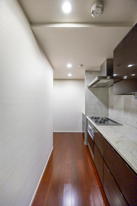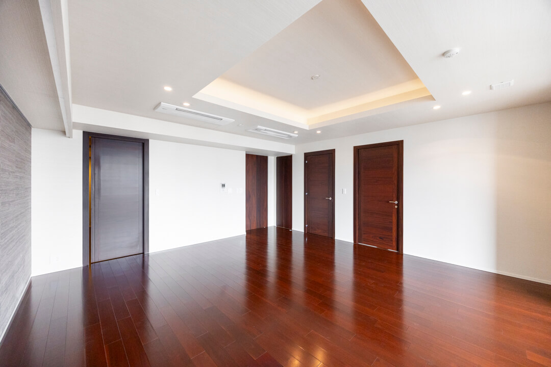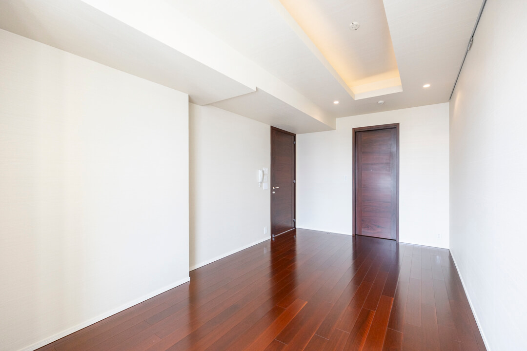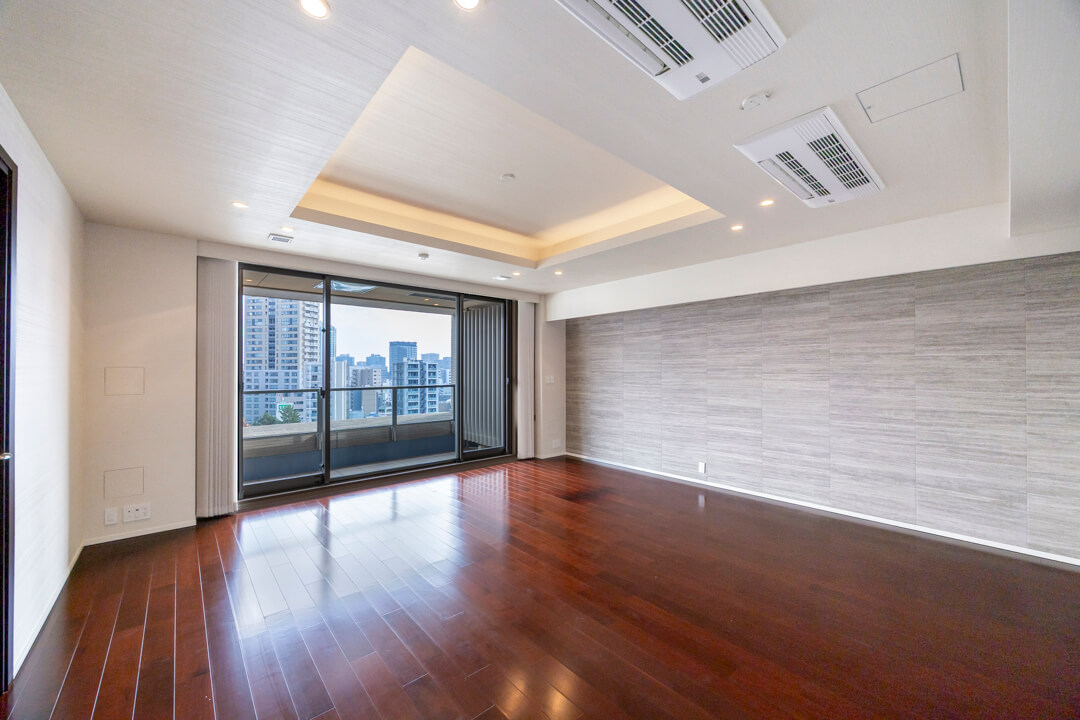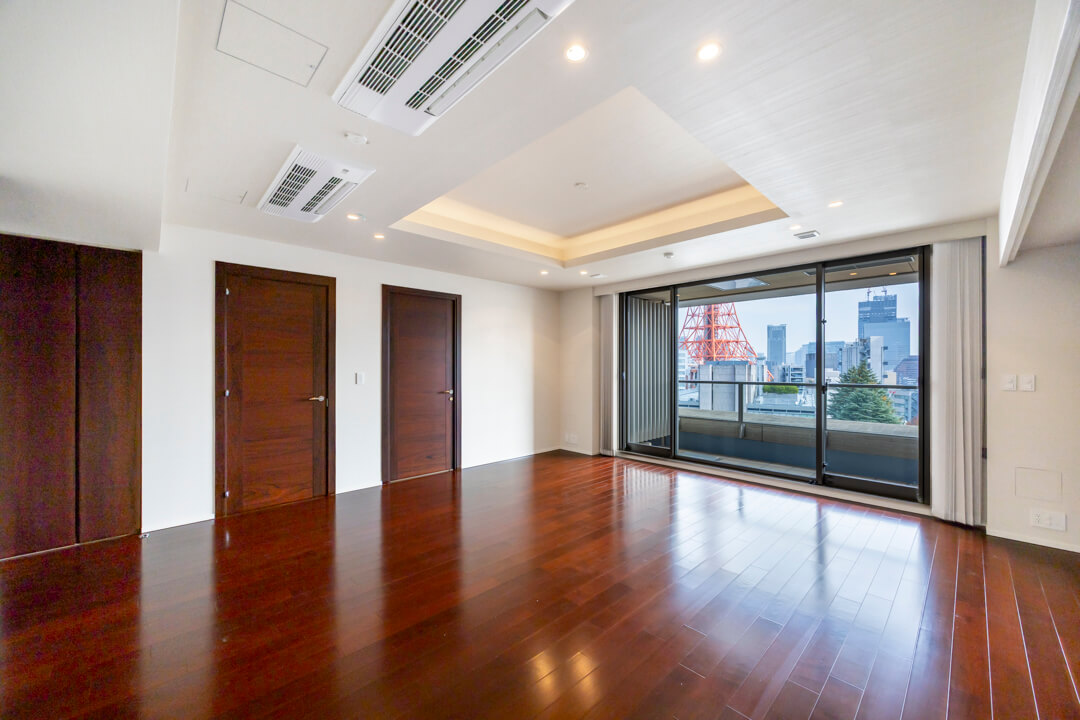 約18.9帖の広々としたリビングダイニングキッチンです。南東向きで日当たりが良好、窓からは東京タワーも望むことができますよ。また、折り上げ天井には間接照明があしらわれていて、お部屋に上品さをプラスしてくれています。エアコンは埋め込み式のためインテリアの邪魔にならないもの◎。