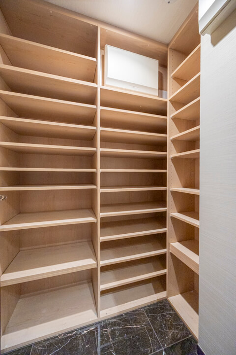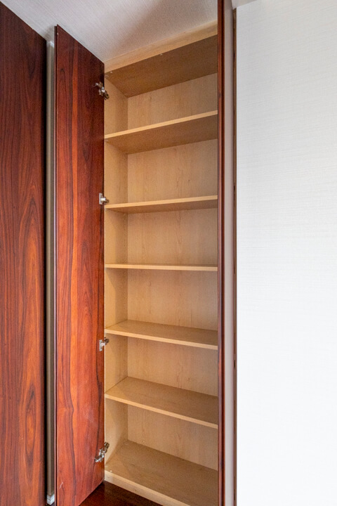 生活感が出がちな小物を収納できる棚やシーズンオフの荷物や大きめの家電などを収納できる納戸が造られています。荷物をきちんと収納できると、居住スペースをより有効的に使えるので便利ですね。