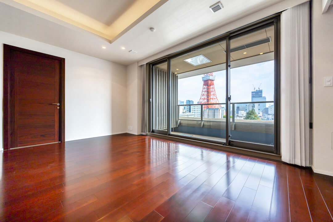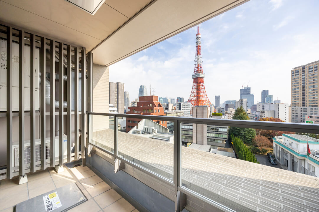 約8.27㎡のゆとりあるバルコニーは南東向きで日当たりが良好です。また、13階部分のため空へと抜けるような眺望が広がっています。都心の気品を象徴する東京タワーを正面に捉え、夜景がひときわ映える、東京タワービューの特別感を味わえます。