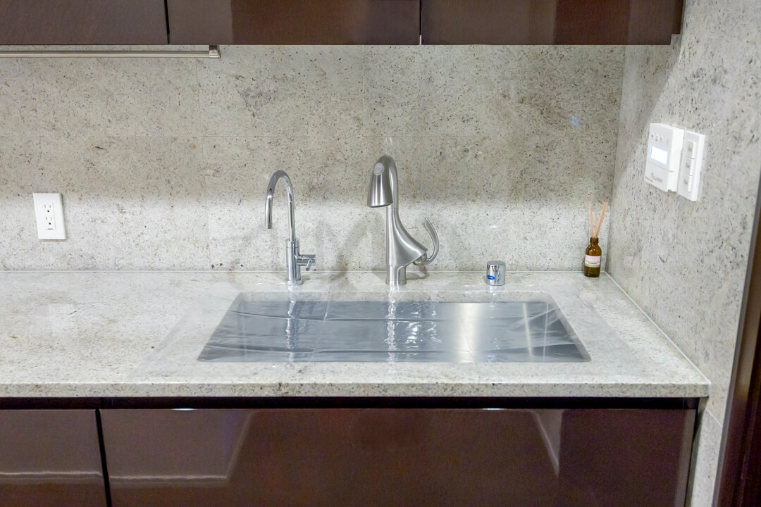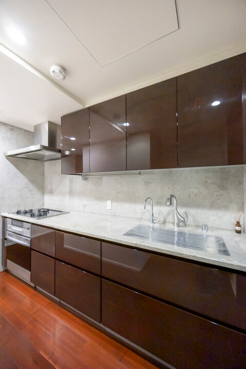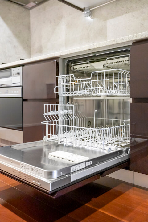 3口コンロ、グリル、オーブン、ディスポーザー、ミーレ製の大型食洗機が搭載されていたりと設備面も充実しています。シンクも広々としているので野菜などが洗いやすそうですよ。