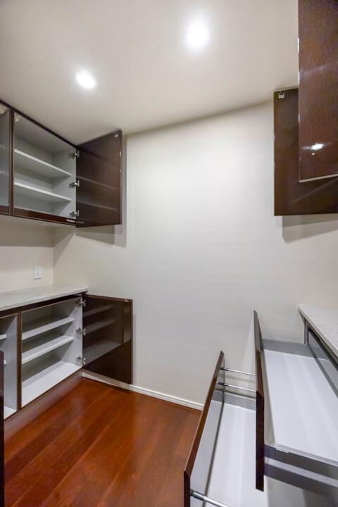 キッチンの奥にはカップボードが2つも備え付けられています。調味料や食器などを収納できるだけでなく、電子レンジなどを置くこともできるので便利です。