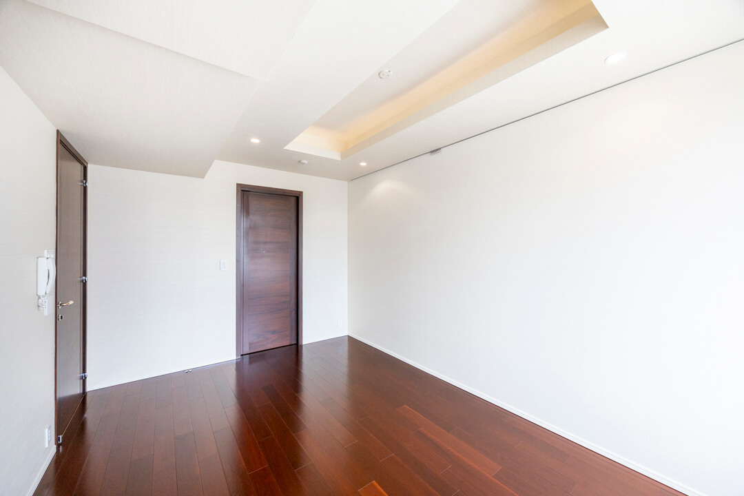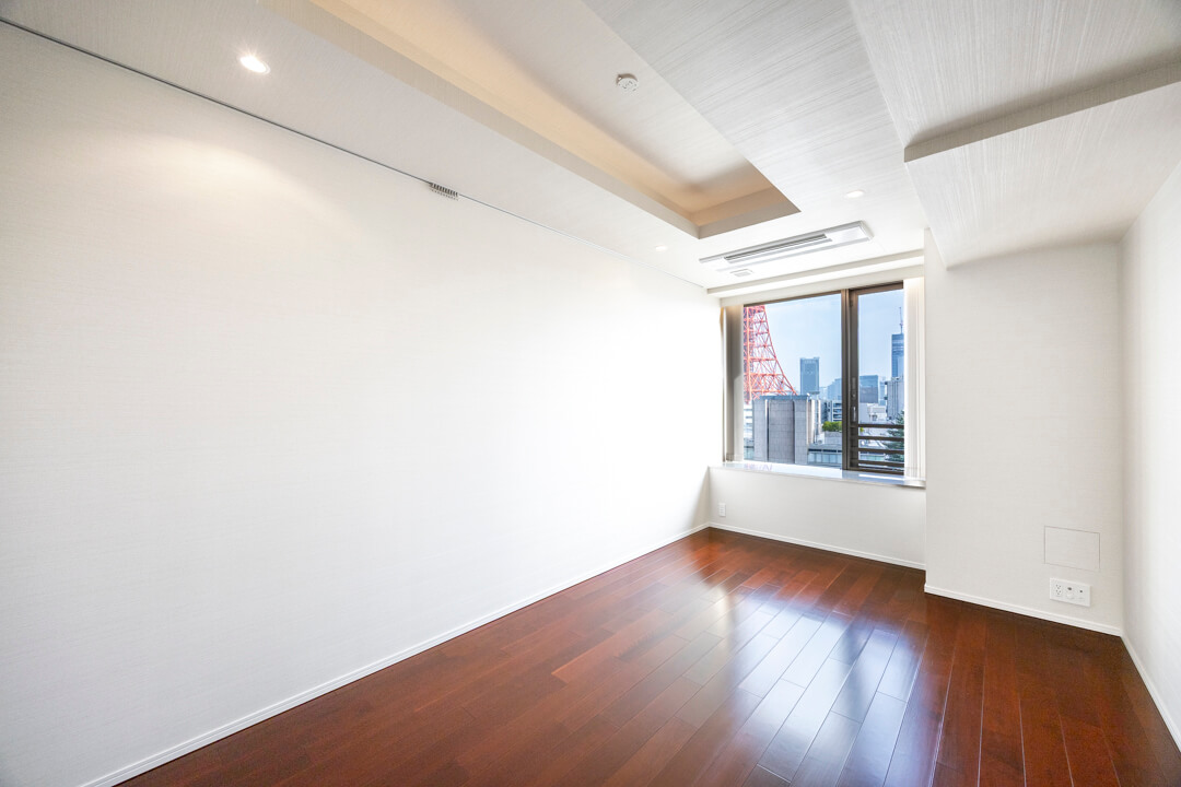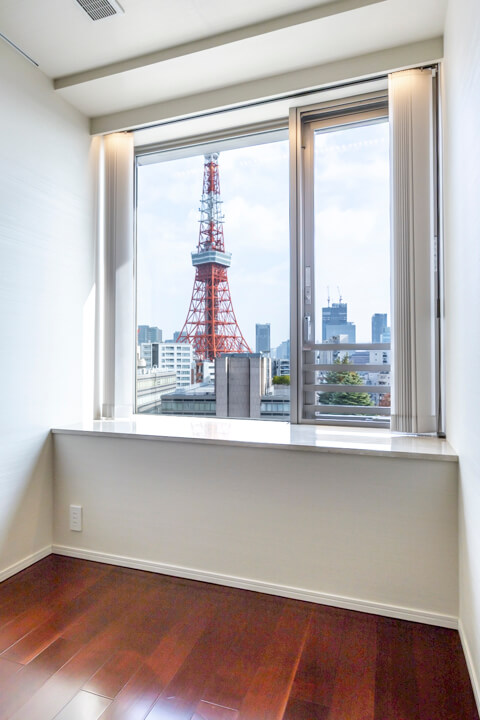 約10.6帖のゆったりとした寝室です。南東側にあるカウンターからは東京タワーを望むことができます。朝・昼・夜で表情が変わるため、時間とともに景色を楽しめそうです。また、壁面にはピクチャーレールが設置されているので、自分好みに空間を演出できますよ。インターホン付で来客対応も可能です。