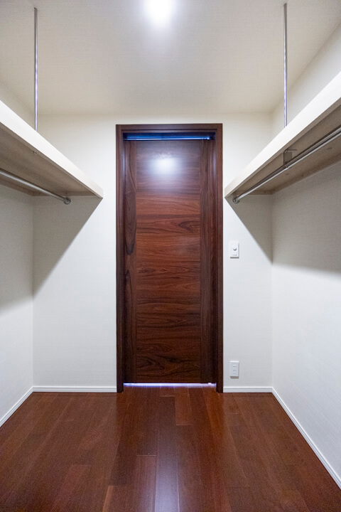 洗面室と寝室から出入りできるウォークスルークローゼットが造られています。両サイドにパイプハンガーと棚板が設置してあり、洋服も選びやすそうです。