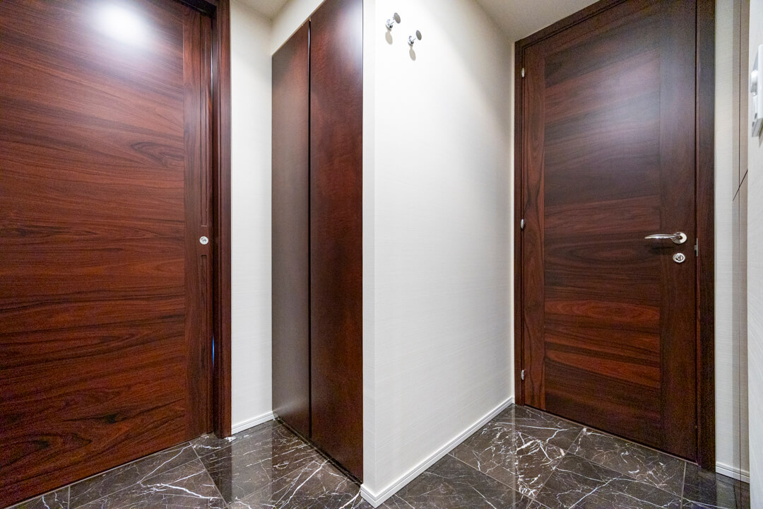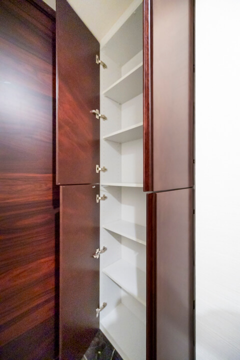 重厚感が漂う玄関には、シューズインクローゼットが造られています。中には棚が設置されているので、たくさんの靴を収納することができますよ。さらに、ゴルフバッグやアウトドアグッズなどを収納できる便利なスペースも造られています。