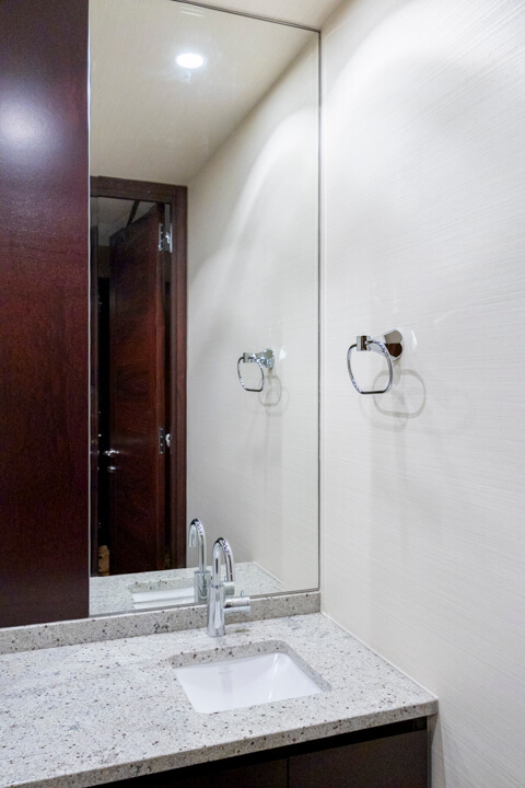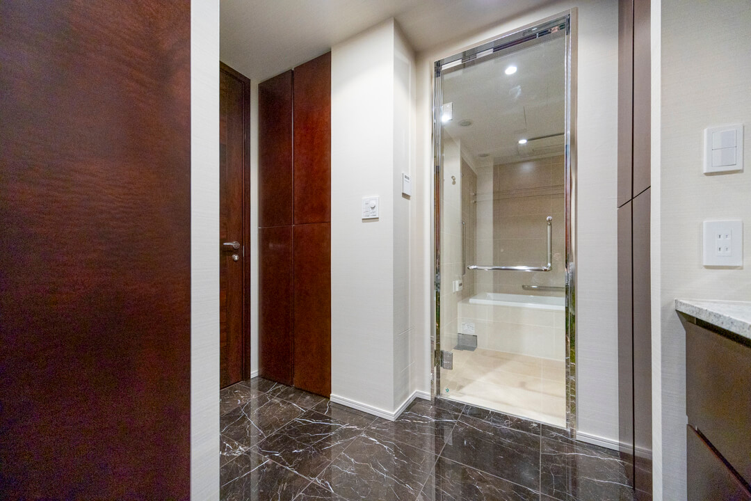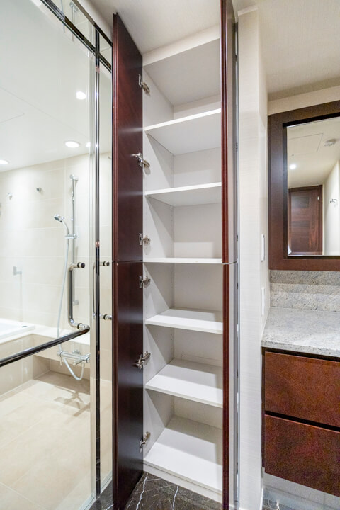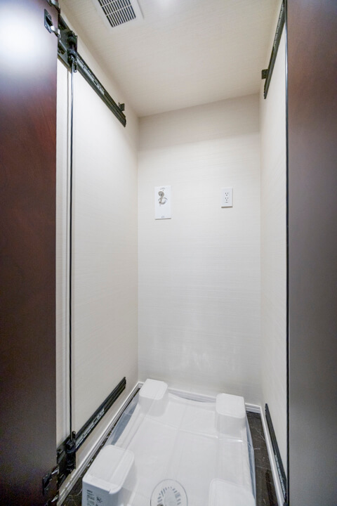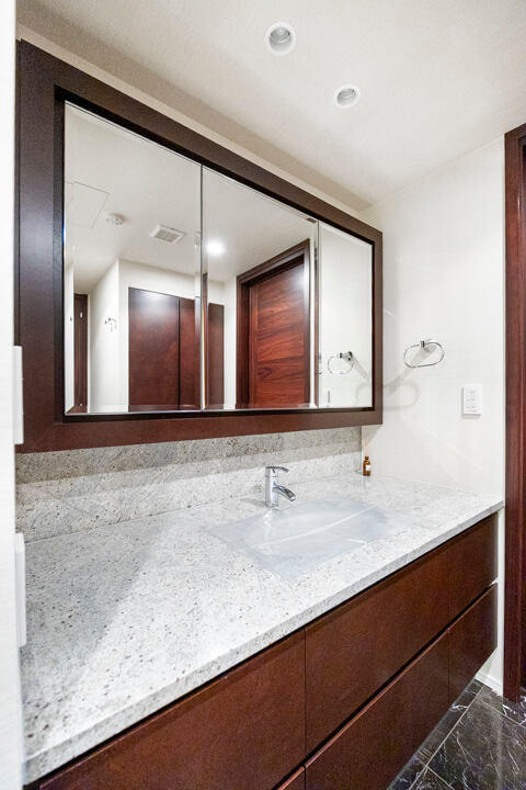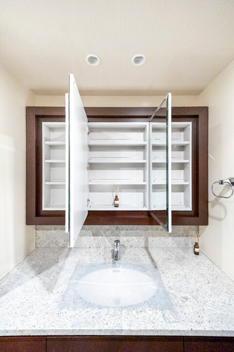 石目調のカウンターで高級感がある洗面化粧台です。大きな三面鏡の中には化粧品などが収納できて使い勝手良好。収納棚も2つ設置されているので、ごちゃごちゃしがちな洗面まわりもすっきりと整頓できます。洗濯機置場に扉が付いているのも◎。また、廊下とウォークスルークローゼットの2ヶ所から出入りができる便利な動線にもなっています。