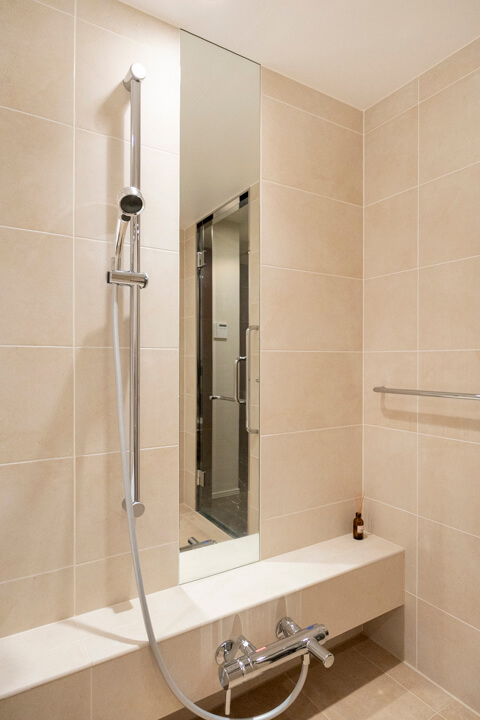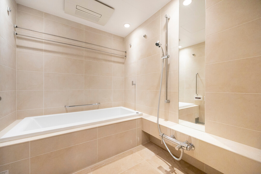 ベージュトーンで落ち着いた雰囲気に包まれているバスルームです。お風呂にゆっくり浸かるのが好きという方に嬉しい追い焚き機能を搭載。家族の入浴時間がずれてしまっても安心です。また、浴室乾燥機には暖房・乾燥・換気・涼風の機能がついており、一年中快適に過ごすことができます。