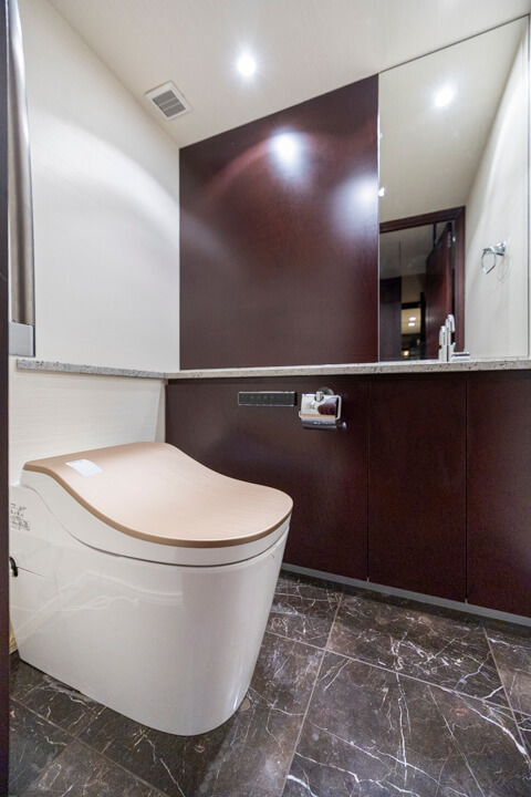ウォシュレット一体型のトイレです。タンクレスタイプなのですっきりとした印象に。また、別途で手洗い器と鏡が造られているので、その場でサッと身だしなみを整えることができます。カウンタースペースにはアロマなどを置いても◎。