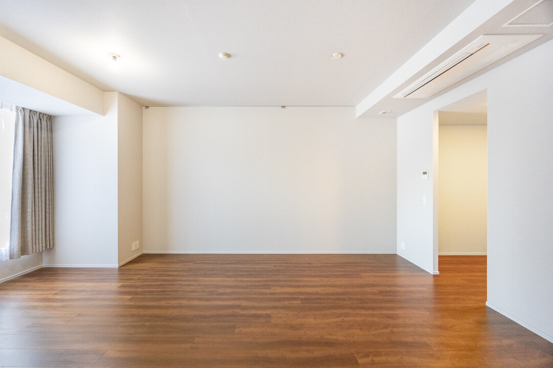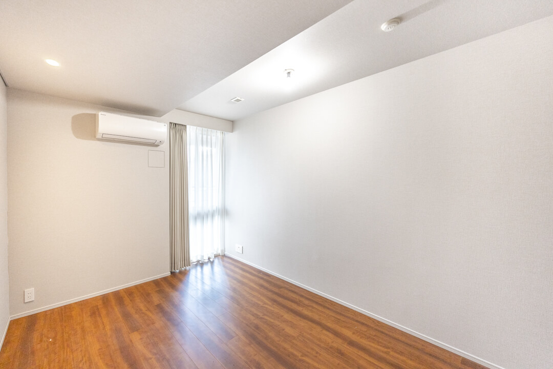 リビングダイニングには寒い時期に嬉しい床暖房が敷設されています。床全体がほぼ均一にあたたまり、陽だまりのような空間に。直接火に触れる心配がないので、ペットのいるご家庭でも安心して使用できそうですね。エアコンはすっきりとした見た目のビルトインタイプで、空間を広く見せる効果も期待できます。