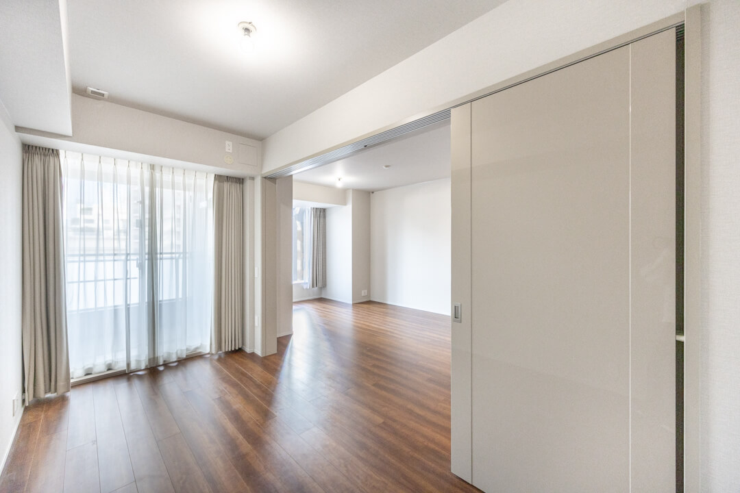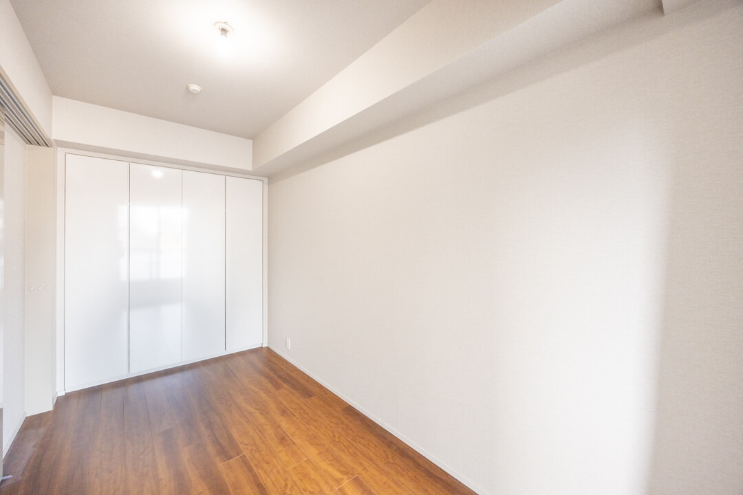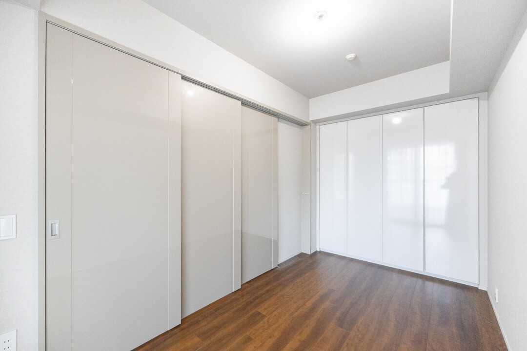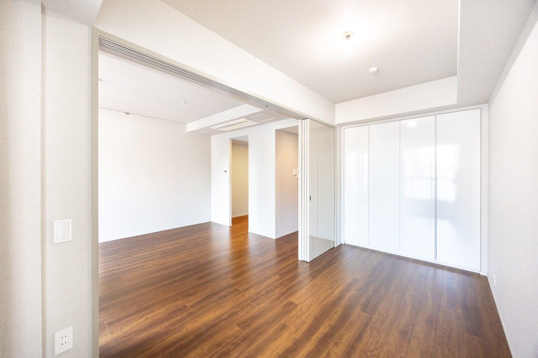 約5.4帖の洋室2。バルコニー付きで奥行きを感じる空間です。壁いっぱいにクローゼットが並び、収納スペースもしっかり確保◎。LDKとは引き戸で仕切られているので、フレキシブルに活用できます。扉を開放して拡張リビングにしたり、閉めてワークスペースやプライベート空間にしたり。ライフスタイルやシーンに合わせて使い分けてくださいね。