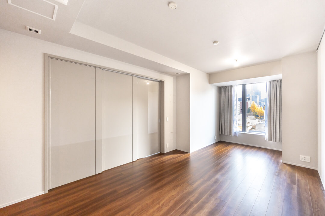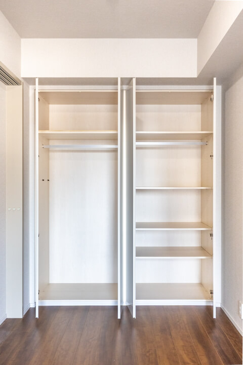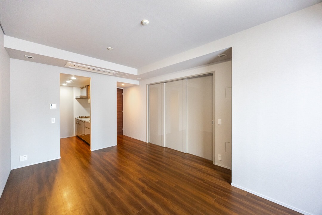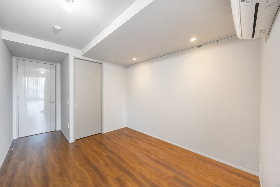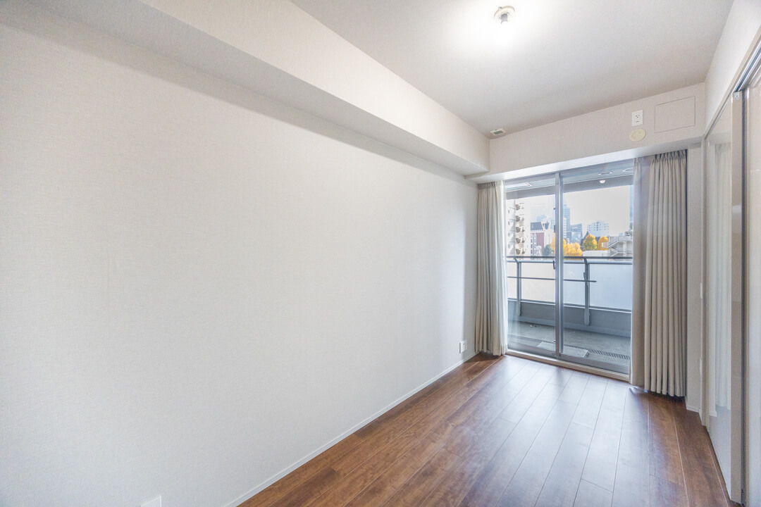 約5.4帖の洋室2。バルコニー付きで奥行きを感じる空間です。壁いっぱいにクローゼットが並び、収納スペースもしっかり確保◎。LDKとは引き戸で仕切られているので、フレキシブルに活用できます。扉を開放して拡張リビングにしたり、閉めてワークスペースやプライベート空間にしたり。ライフスタイルやシーンに合わせて使い分けてくださいね。