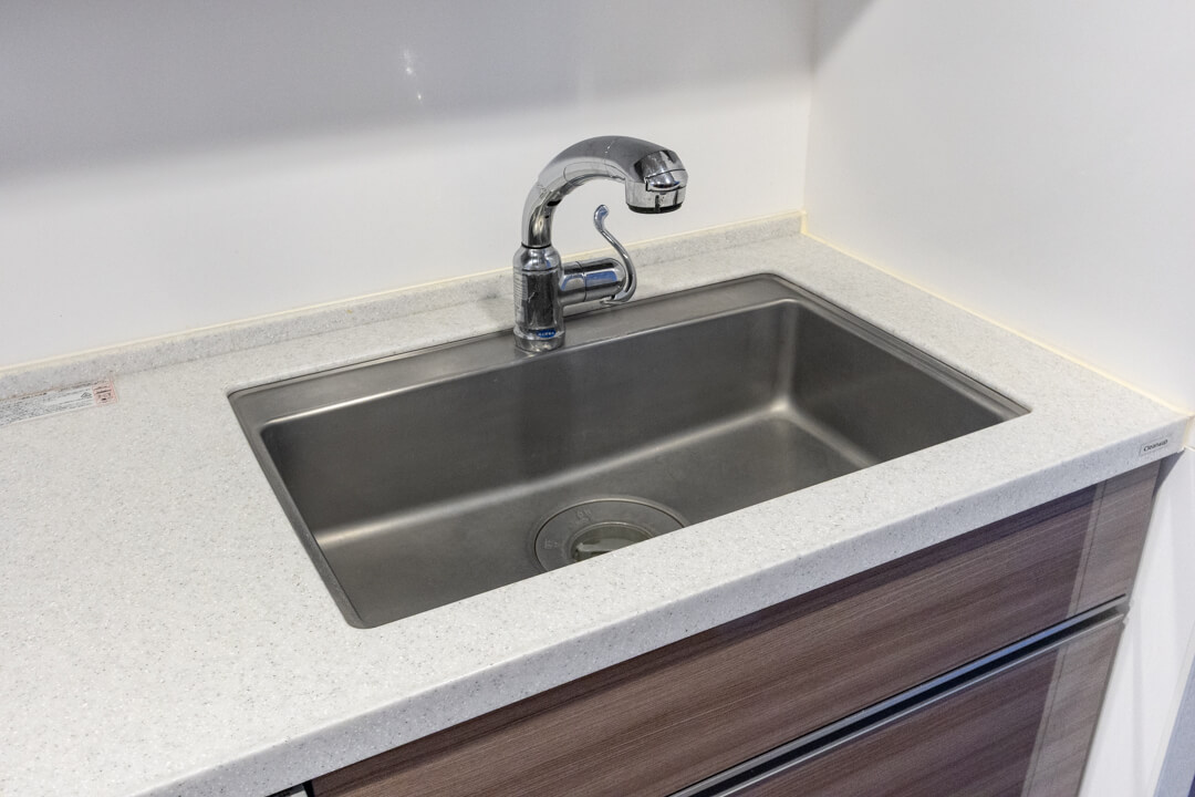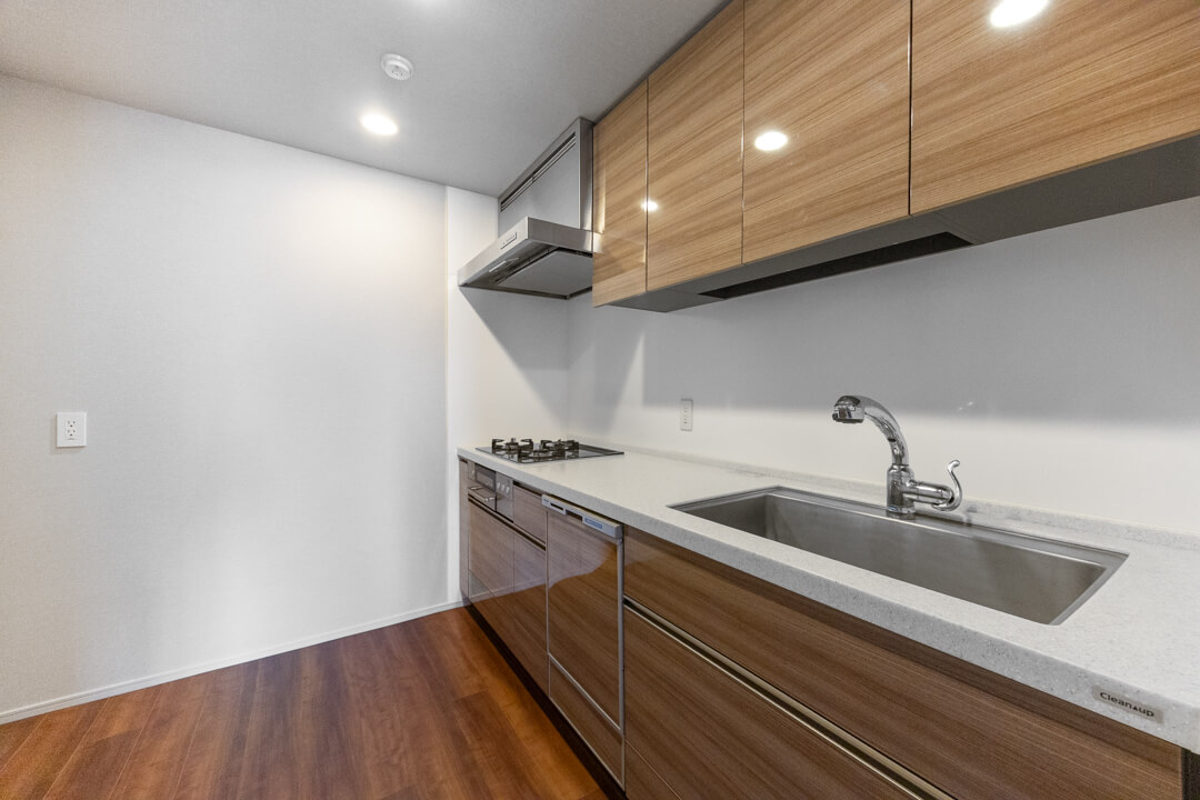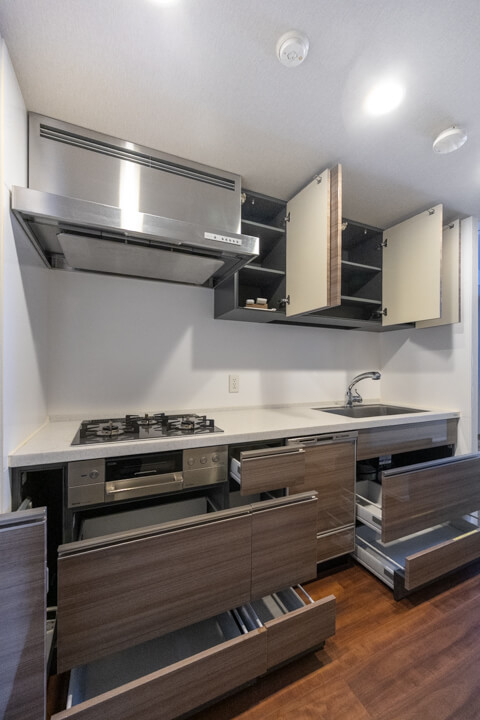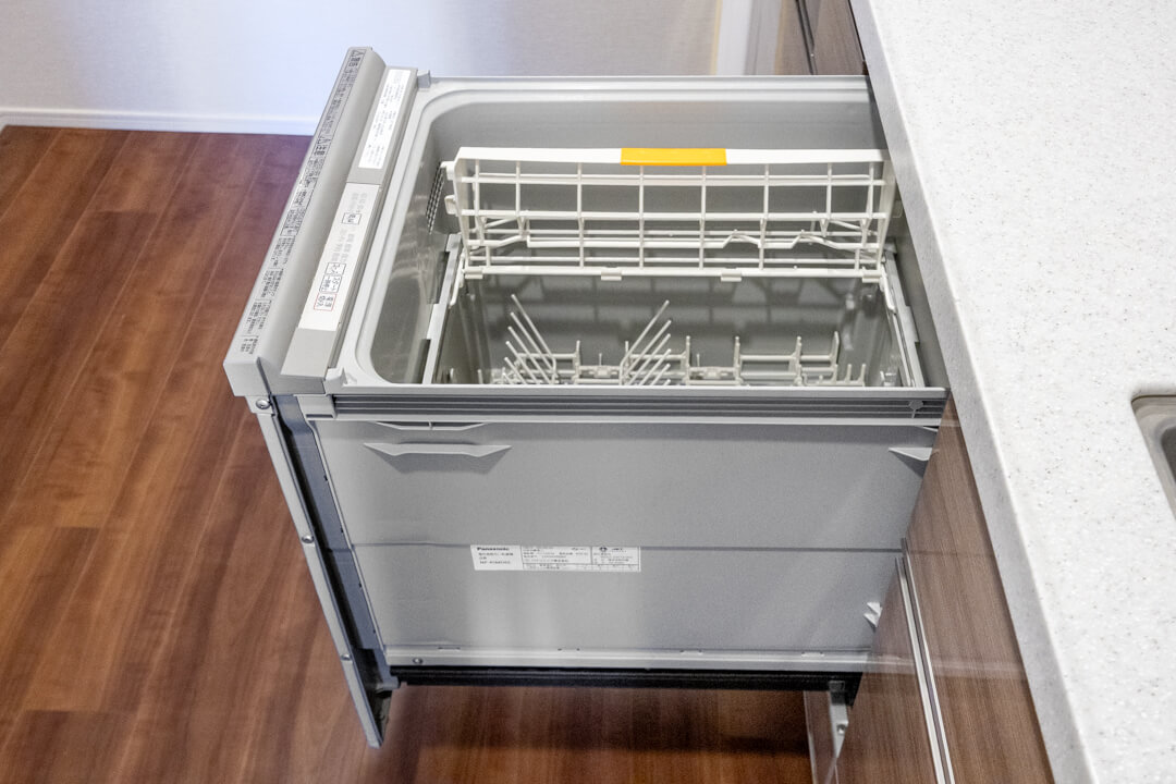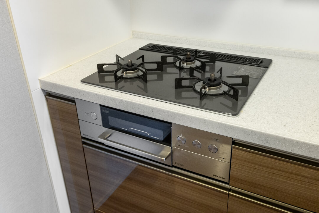 同時調理が叶うグリル付3口ガスコンロを内蔵。さらに、ディスポーザーと食洗機も完備されています。料理後すぐに生ゴミを処理できるので、悪臭の原因を防ぎ、掃除の手間を軽減。食器洗いも捗り、後片付けの時短が叶います。