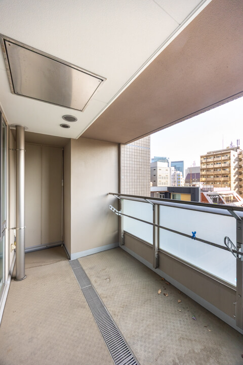 洋室2部屋に跨るバルコニー。9.00㎡で奥行きがあり、広々とした印象です。南向きで日当たり良好◎。晴れの日にはあたたかい光が届きそうですね。木々の緑が見える穏やかな眺めも魅力的です。